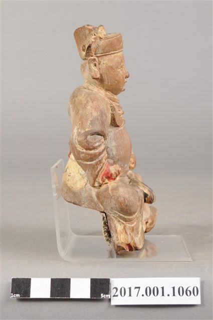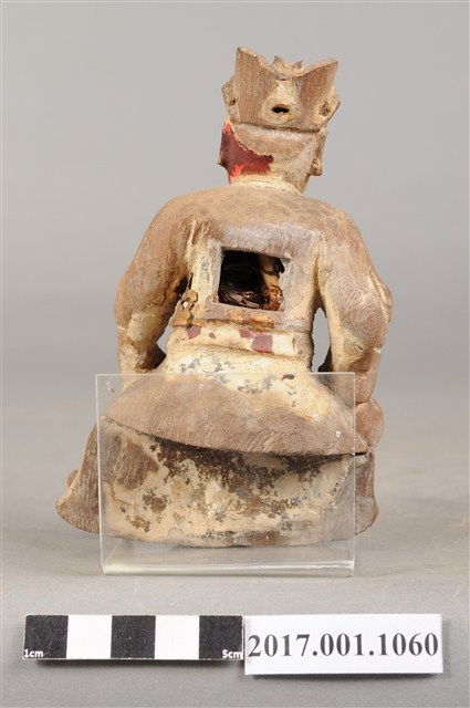 1.本件木雕廣澤尊王像,作坐姿姿態,屬「脫椅」作法,臺座已遺失,表面施作塗裝、安金不見紅粉線盤飾粧佛技法,粧佛大部分已除去,背部開有方形入神洞,封榫佚失,露出洞內入神物。臉型輪廓圓潤,雙眼圓睜,顏面表現青年男性相貌。頭戴三山帽,身作「衷甲」式的裝束,身著鎧甲,外套著窄袖蟒袍,在衣領處露出鎧甲,肚腹圓凸,腰束腰帶,袍服下襬處可見粉線盤飾蟒紋,腳穿皂靴。挺身端坐,左腳自然垂下,右腳翹起,作單腳盤坐姿態。