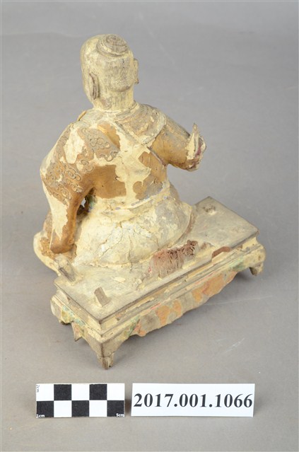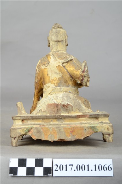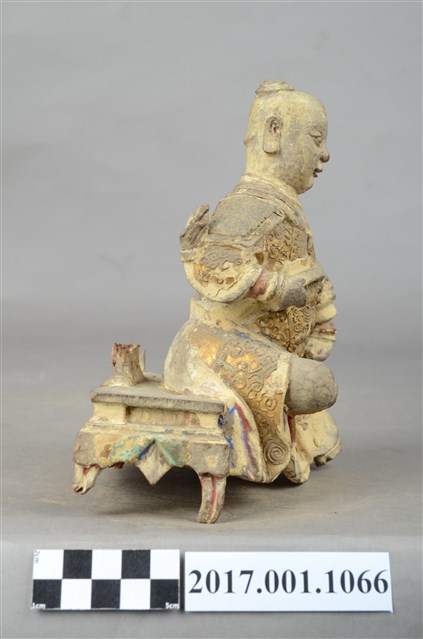1.本件木雕廣澤尊王像,作坐姿姿態,坐於圈背椅上,表面施作塗裝、安金不見紅漆線盤飾粧佛技法,粧佛局部剝落。臉型輪廓橢圓,雙眼圓睜,顏面表現青年男性相貌。頭頂梳髮髻,身作「衷甲」式的裝束,內著鎧甲,外著蟒袍,右肩與右腿露出鎧甲,肚腹圓凸,腹下束腰帶,胸前有看帶,蟒袍漆線盤飾蟒、雲紋飾,腳穿皂靴。挺身端坐,左手握拳置於左腿上,右手小臂上抬握看帶。左腳自然垂下,右腳翹起,作單腳盤坐姿態,圈背椅的椅背、扶手、椅足損毀。