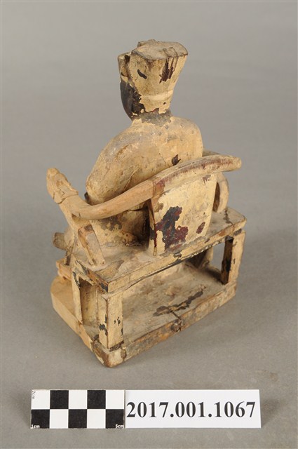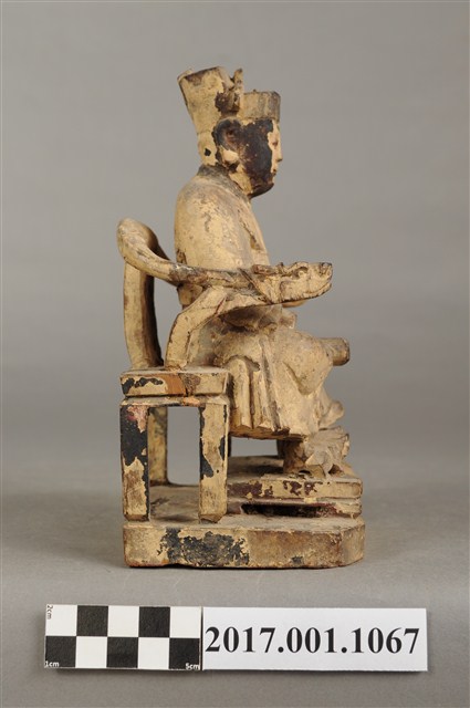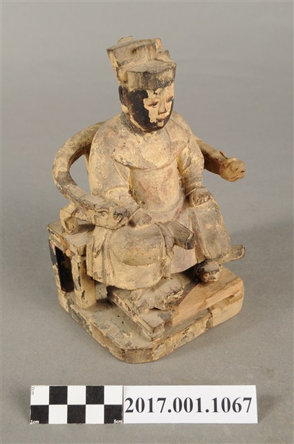 1.本件木雕廣澤尊王像,作坐姿姿態,坐在圈背椅上,粧佛已清除,僅存顏面周圍部分漆面。臉型輪廓豐潤,顏面表現青年男性相貌。頭戴硬殼幞頭,身著窄袖大袍,大袍的衣領外翻,肚腹圓凸,腹下束腰帶,腳穿皂靴。挺身端坐,雙手握拳分置於雙腿上,左腳自然垂下,踏獸座,右腳翹起,作單腳盤坐姿態。圈背椅的扶手出頭雕刻龍頭,椅前有踏几,踏几上有獸座,臺座呈方形。踏几、臺座左側損毀,另以木頭拼接。