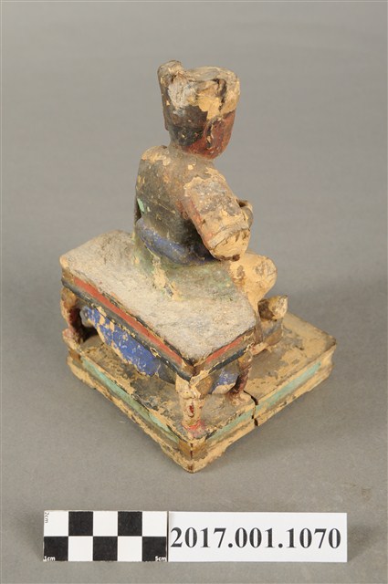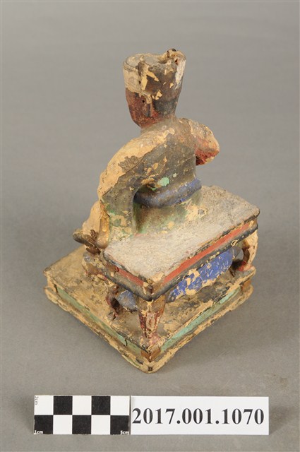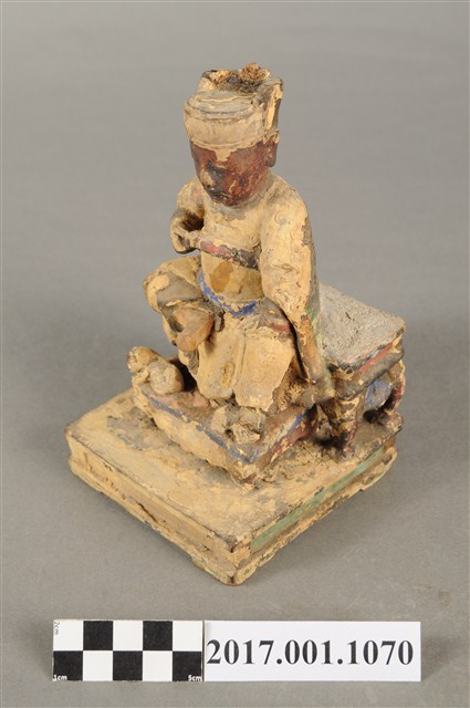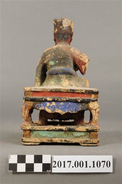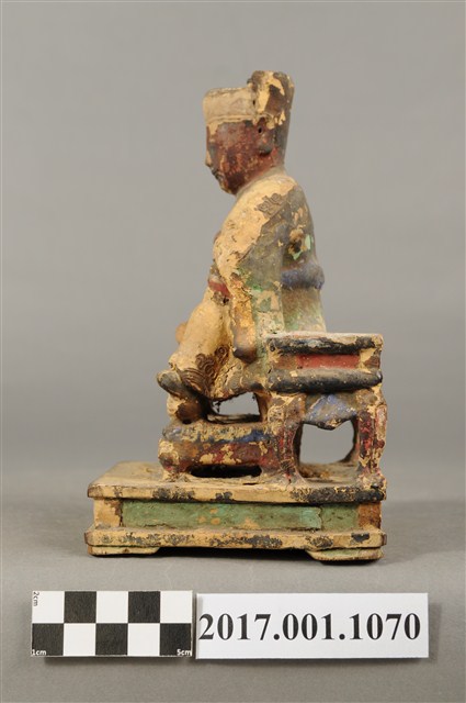 1.本件木雕廣澤尊王像,作坐姿姿態,坐在圈背椅上,表面之漆面剝落嚴重,殘留臉部漆面。臉型輪廓豐潤,雙眼圓睜,顏面表現青年男性相貌。頭戴三山帽,身著窄袖大袍,大袍衣領外翻,肚腹圓凸,腰束玉帶,胸前有看帶,腳穿皂靴。挺身端坐,左手扶於左腿上,右手小臂上抬握看帶。左腳自然垂下,踏獸座,右腳翹起,作單腳盤坐姿態。圈背椅的椅背與左右扶手斷裂,椅足雕刻螭虎吞腳,椅前有踏几,踏几上放置獸座。臺座呈方形,底端殘留墨書文字,兩端「聖王」、「下厝」清晰可辨,其餘字跡磨損無法辨識。