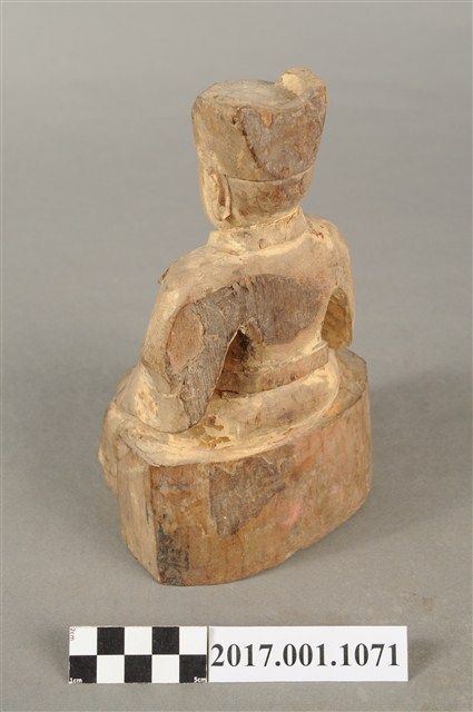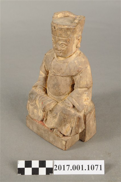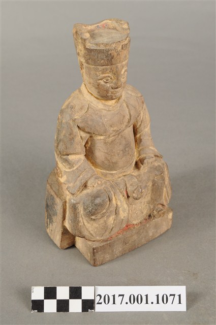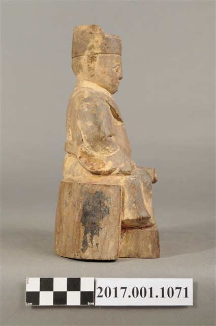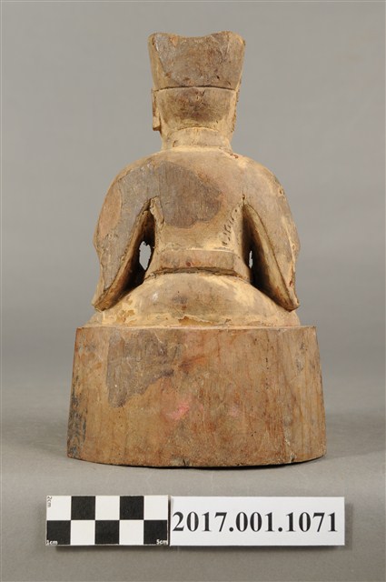 1.本件木雕廣澤尊王像,作坐姿姿態,坐在臺座上,粧佛已清除。臉型輪廓豐潤,雙眼圓睜,顏面表現青年男性相貌。頭戴三山帽,身著窄袖大袍,大袍衣領外翻,肚腹圓凸,腰束腰帶,腳穿皂靴。挺身端坐,雙手握拳分置於腿上。左腳自然垂下,踩於踏几上,右腳翹起,作單腳盤坐姿態。