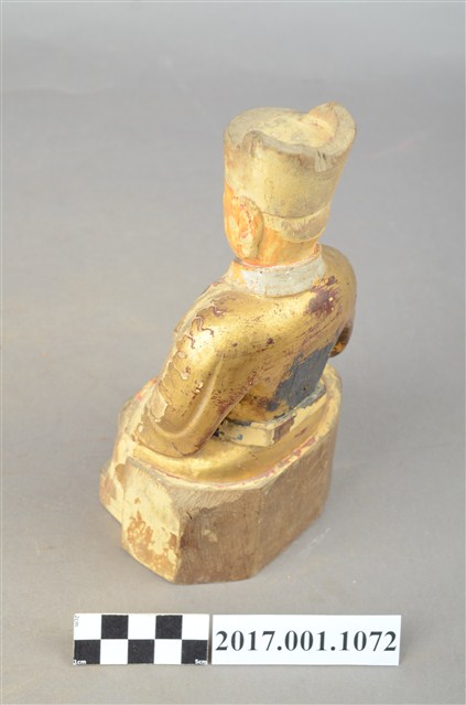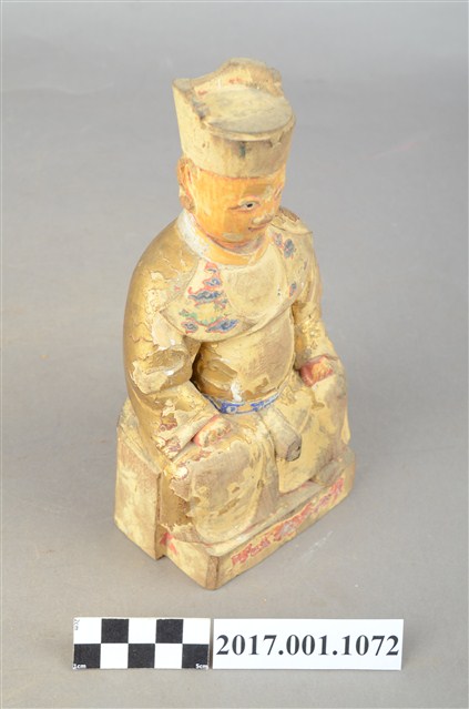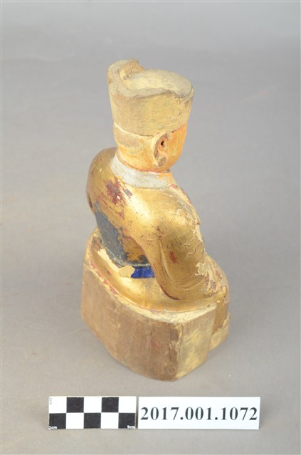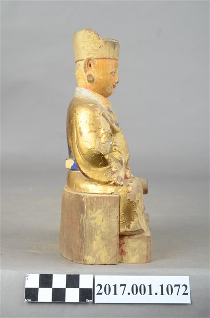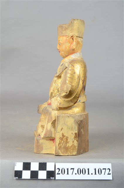 1.本件木雕廣澤尊王像,作坐姿姿態,坐在臺座上,表面施作塗裝、安金不見紅粉線盤飾粧佛技法,粧佛剝落嚴重。臉型輪廓豐潤,雙眼圓睜,顏面表現青年男性相貌,頭戴三山帽,身著窄袖蟒袍,蟒袍的衣領外翻,肚腹圓凸,腰束腰帶,腳穿皂靴。挺身端坐,雙手握拳分置於腿上。左腳自然垂下,右腳翹起,作單腳盤坐姿態。臺座前方殘留朱紅色彩繪寶相花紋。