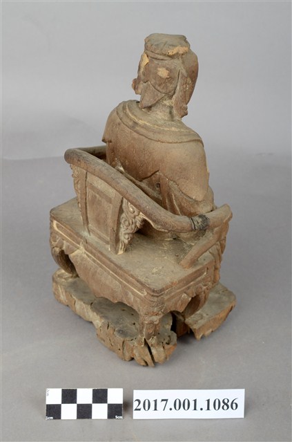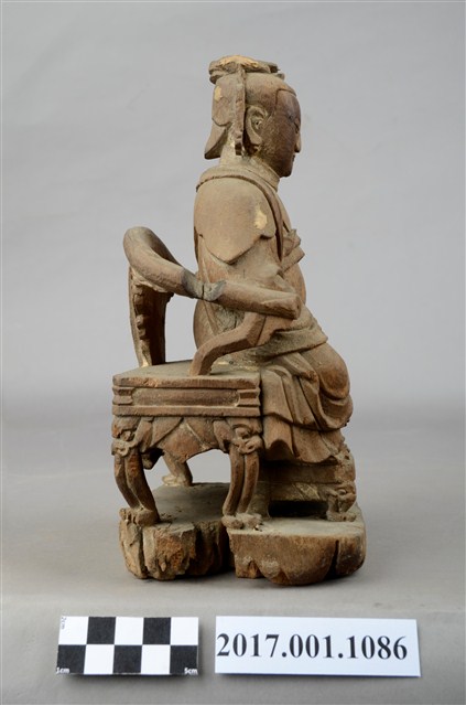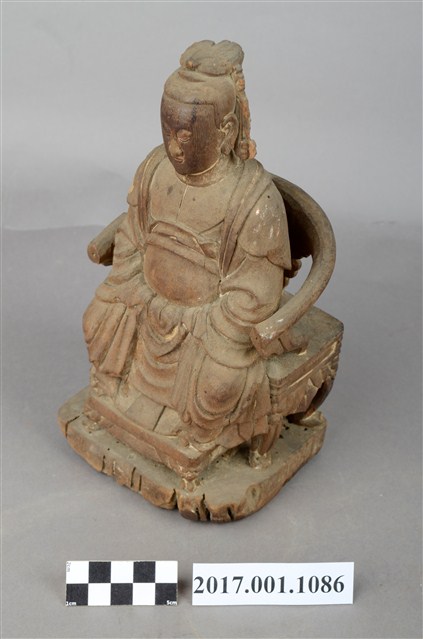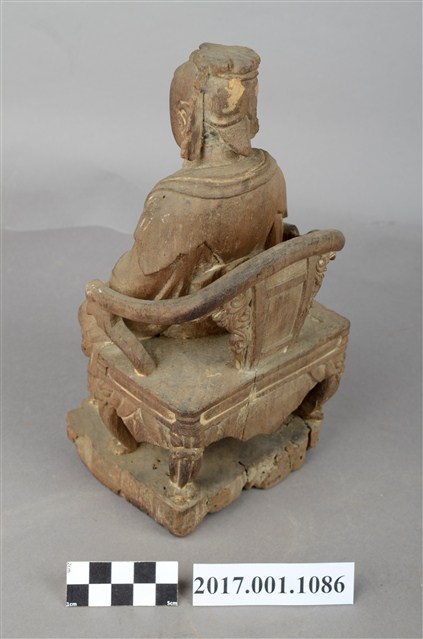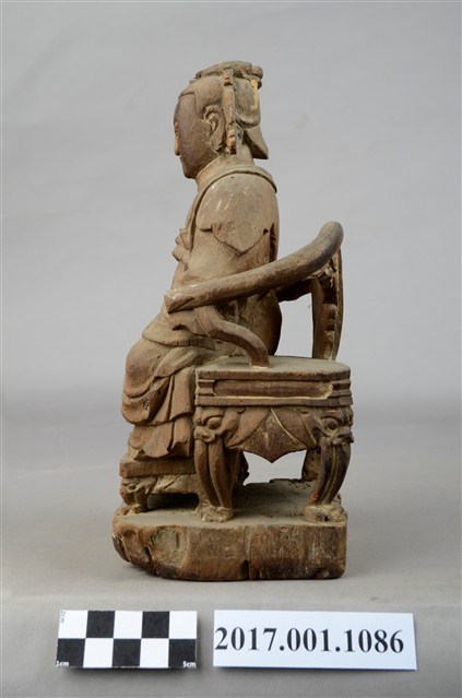 1.本件木雕瑤池金母像採坐姿,表面粧佛已脫落。瑤池金母端坐於一圈背椅上,圈背椅兩側扶手之頂端缺損,露出小型卯眼。椅足作獅吞式樣,圈背椅下另有一大型方形臺座,臺座嚴重蛀蝕,不平整。王母端坐,臉呈鵝蛋臉,臉孔莊嚴,面帶慈容,金母頭梳髮髻,頭戴鳳冠,後腦梳有尖尾髻。冠之鳳翅垂於兩耳側。身著袍服長裙,身披雲肩,兩肩披一長飄帶,垂於兩腋下,腰束玉帶,胸前束看帶。雙手交握於腹前,手掌藏於水袖內。雙足自然下垂,腳著弓鞋,足下踩有一小型踏几,踏几腿部雕成獅吞式樣。