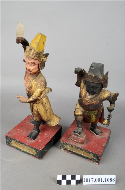 1.本組謝范將軍像為木雕製成,表面施以彩繪粉線安金粧佛。謝將軍身形修長,臉色蒼白,范將軍身形矮胖,臉色黝黑,兩位將軍手持物,站在臺座上。