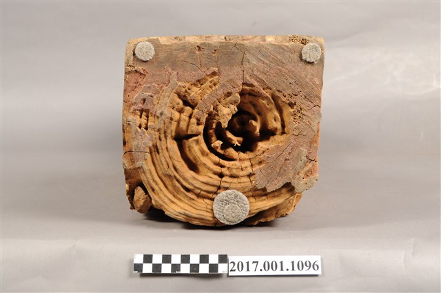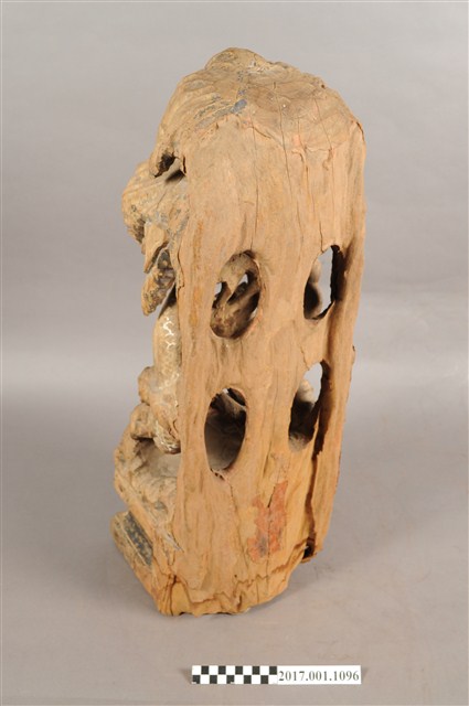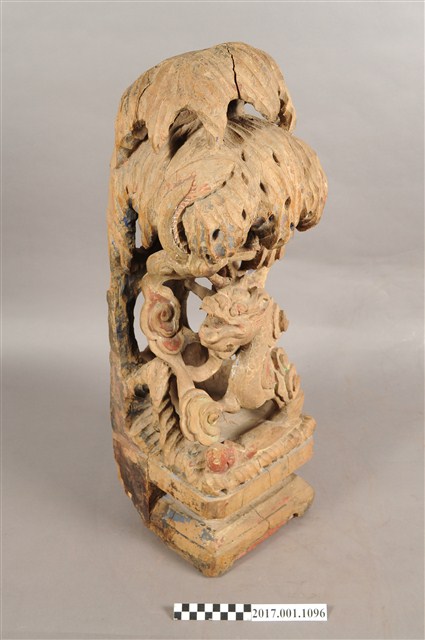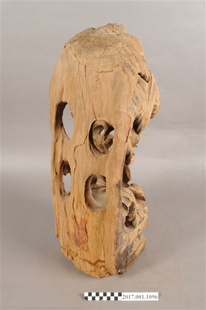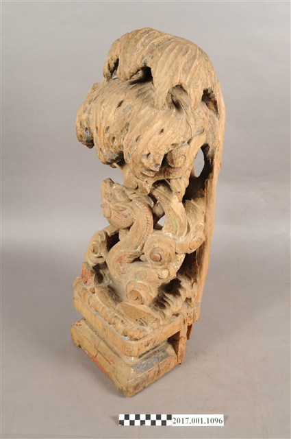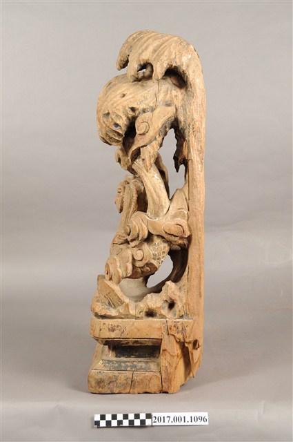 1.本件木雕龍神像,表面施作塗裝,局部漆面剝落。上方雕刻岩石,龍神盤繞向右,龍尾朝向上,龍身旁有雲紋,形成騰雲駕霧的意象,龍下有海浪,浪中有一隻鯉魚。臺座表現為案几的形式,底部蛀蝕損毀。