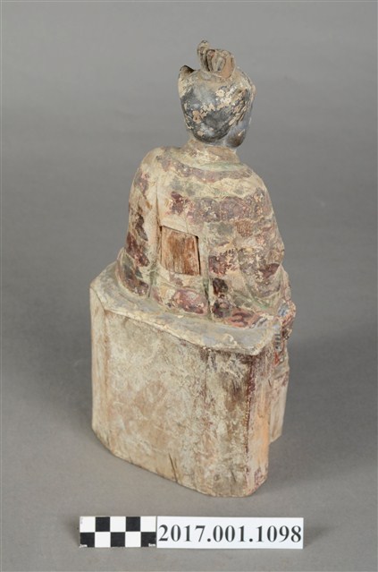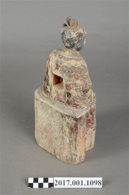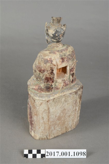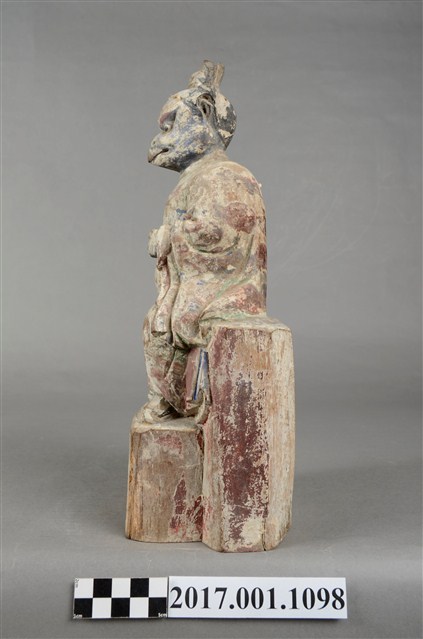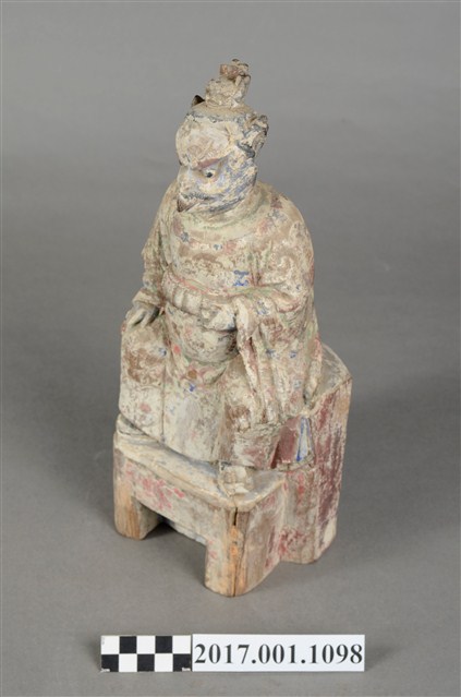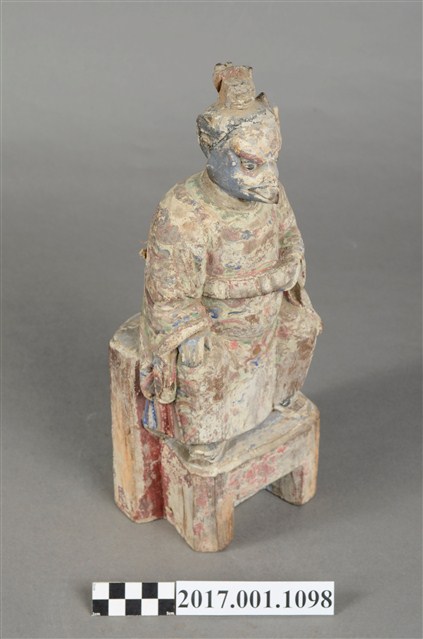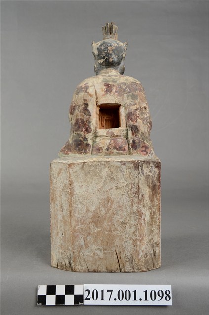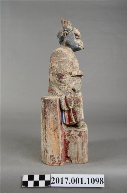 1.本件木雕應靈公鍾部像,採坐姿姿態,坐於臺座上,表面粧佛大多已褪去,依稀尚存部分彩繪,背面開有方形入神洞,封榫可取下,入神物尚存。鍾部作獸首人身,頭部顏面表現眉骨凸出,耳旁鬢髮朝天,凸眼圓睜,鳥嘴。頂佩戴小冠,身著寬袖盤領衣,肚腹圓凸,腹上束看帶,腳穿皂靴。挺身端坐,雙足垂下,左手握著看帶,右手掌放於右腿上。臺座前下方雕刻成踏几的形式。鳥頭人身的神像除了應靈公鍾部,尚有雷公也是此造形,然而雷公神像罕見身著衷甲、坐姿。