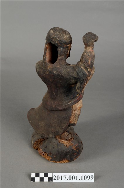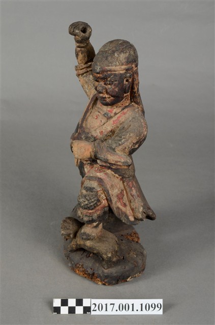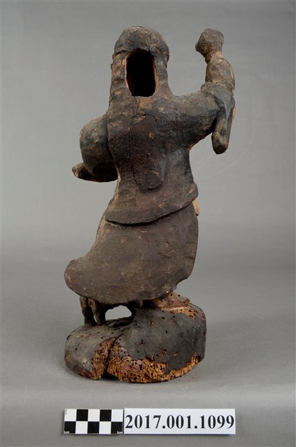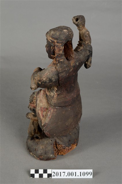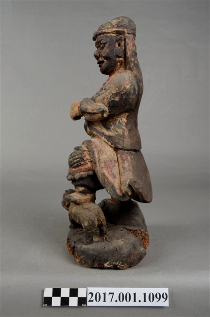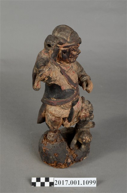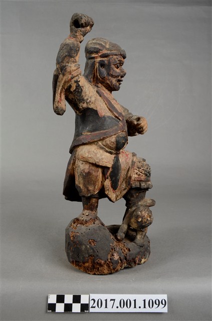 1.本件木雕趙元帥像作立姿,表面施以錦雕彩繪技法粧佛,粧佛部分剝落,腦後開有橢圓形入神洞通口部,內部物件已取出。羅漢雙目瞠視,開口,鼻頭顴骨凸出,表情威武嚴肅。披髮戴金箍,內穿鎧甲,外罩對襟杉,腹前有護心鏡。左手握拳置於胸前,右手握拳高舉。雙腳穿皂靴,右腳踏岩座上,左腳上抬踏於虎背上,虎側身站立,頭部望向趙元帥。臺座作圓岩座。
