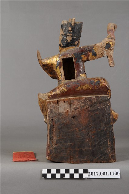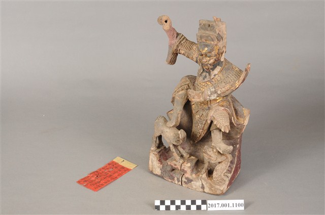 2.木雕趙元帥採坐姿,坐於椅凳上,表面作錦雕技法並安金彩繪製成,安金層大部分脫落,背後開有長方形入神洞,封榫尚存,封榫背面寫有銘文「光緒庚寅年花月十二日,求保發財大□吉」。元帥雙眼瞠目,皺眉,顴骨凸出,嘴邊雕有長髯,表情威武莊嚴。頭戴幞頭,身穿鎧甲,雕飾鱗片等紋,雙腳穿皂靴。左手持元寶置於胸前,右手握拳高舉,手中持物遺失。左腳踏龍,右腳上抬於虎背上方,龍嘴蓄有長鬚抬頭仰望,龍鱗雕刻分明,老虎曲背仰望,尾部斷裂。神像動作極具張力,姿態威武生動。