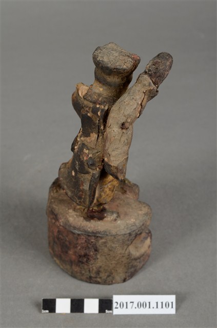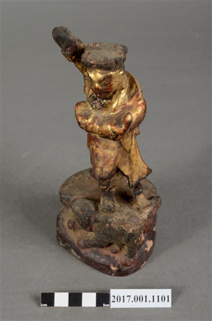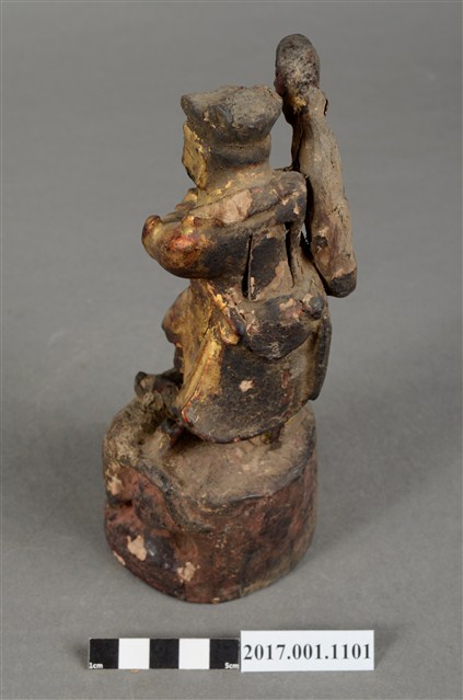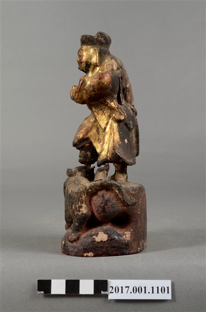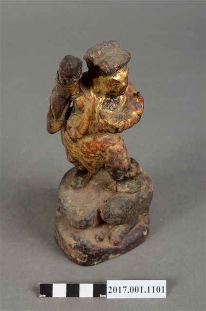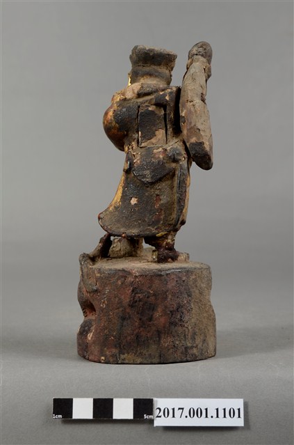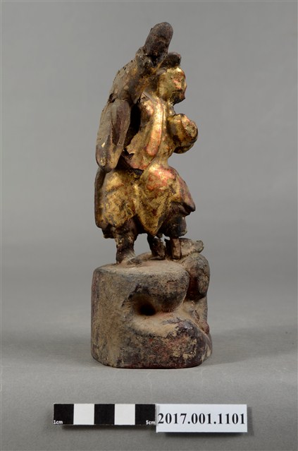 1.本件木雕趙元帥像作立姿,表面飾以安金粧佛,神像尺寸微小,細節模糊。趙元帥臉色安金,蓄有黑鬚,五官以筆繪成。頭戴幞頭,身穿金色長袍,左手持元寶置於胸前,右手高舉過頭。雙足穿皂靴,左腳在前,足尖腳朝前,右腳在後踏於地面上,呈丁字步姿態。臺座作高岩臺。