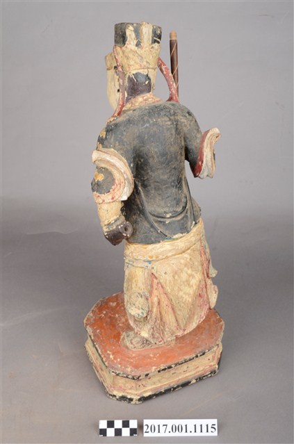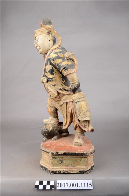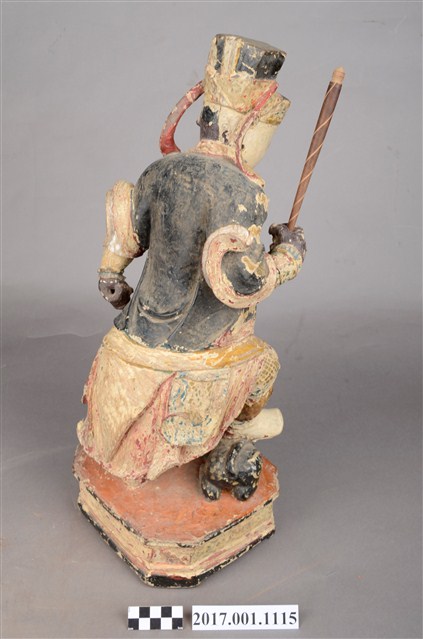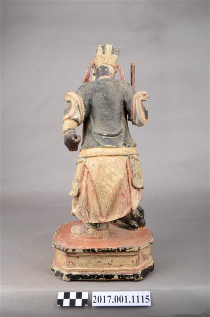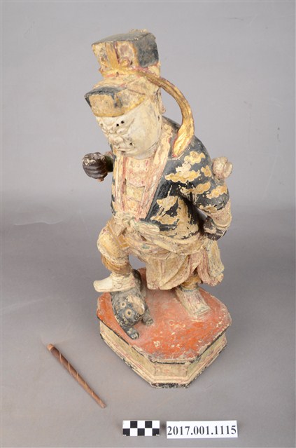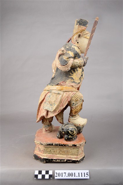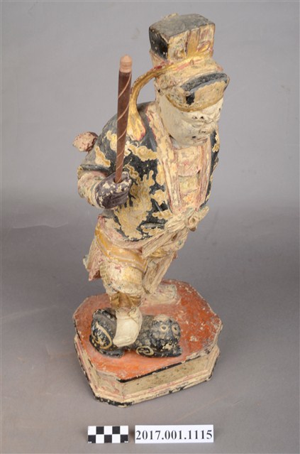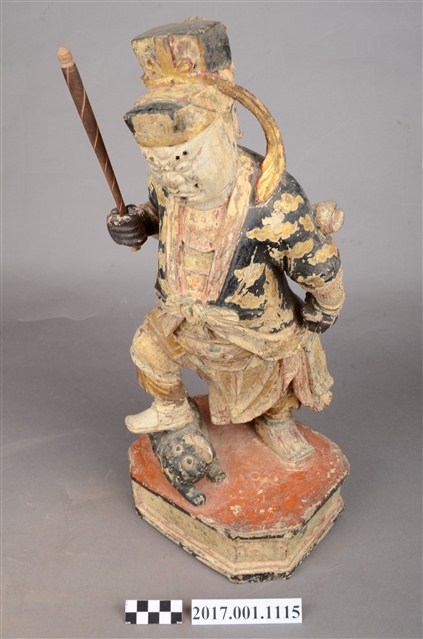 1.本件木雕趙元帥像,作立姿姿態,表面施作塗裝、安金不見紅粧佛技法,粧佛局部剝落。頭部微斜向左,雙眼瞠目,皺眉,眉骨、顴骨凸出,眉骨、鼻翼兩側、下頷皆有植鬚孔,眉毛與鬍鬚斷裂脫落。頭戴硬殼幞頭,幞頭帽帶垂至兩肩上。身著鎧甲,外罩黑色雲紋開襟短衫,腰束腰帶,護腹以腰帶固定,前方雕刻獸頭,正面的腰帶下有前擋與左右擋鎧甲,鎧甲表現甲冑紋,雙腳穿皂靴。立像挺身站於臺座上,左手握拳下垂,右手小臂上舉握棍。右腳在前踏虎,左腳在後踏臺座。腳下黑虎呈趴伏狀,頭部朝左,前肢向前伸出,臺座呈現八角形。