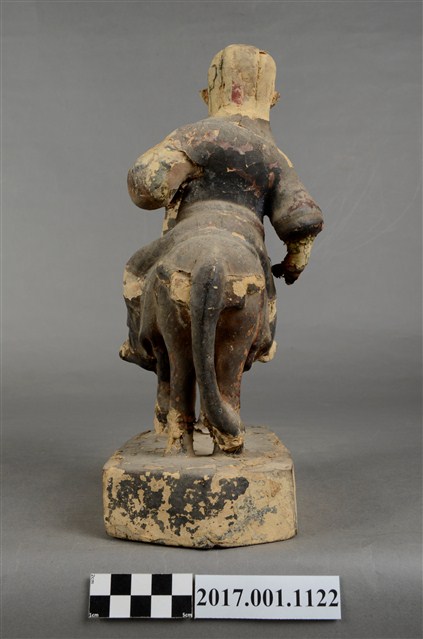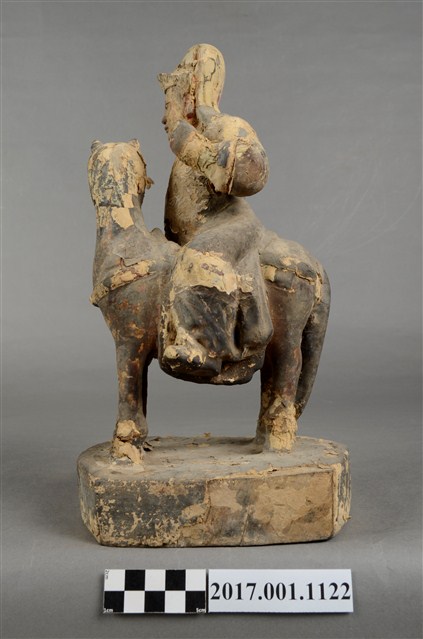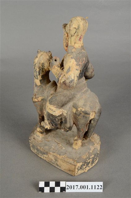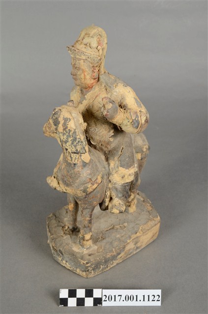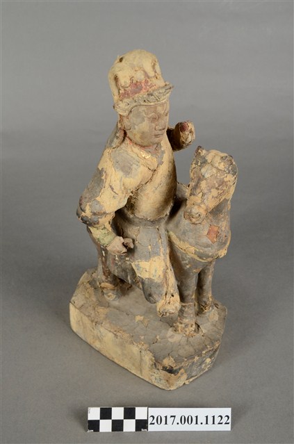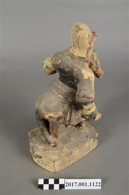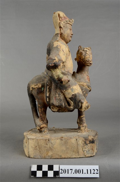 1.本件木雕謝府元帥像作帶騎姿態,跨坐於馬背上,表面風化剝落,露出底層麻布。元帥作青年男子相貌,雙目半睜,臉型圓潤,神態莊嚴。元帥身體稍向右傾,頭部略轉向右方,頭戴兜鏊,身穿甲袍,腳穿皂靴,左手握拳持舉,右手握拳置於腰部,所持物遺失。黑馬身形精瘦,四肢直立,尾巴垂於後腿,頭部轉向右側,黑馬四蹄有斷裂痕跡。臺座作方矮臺。