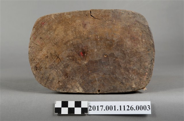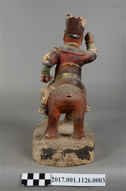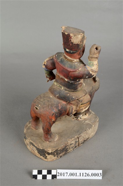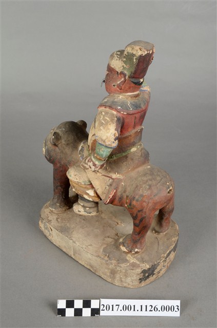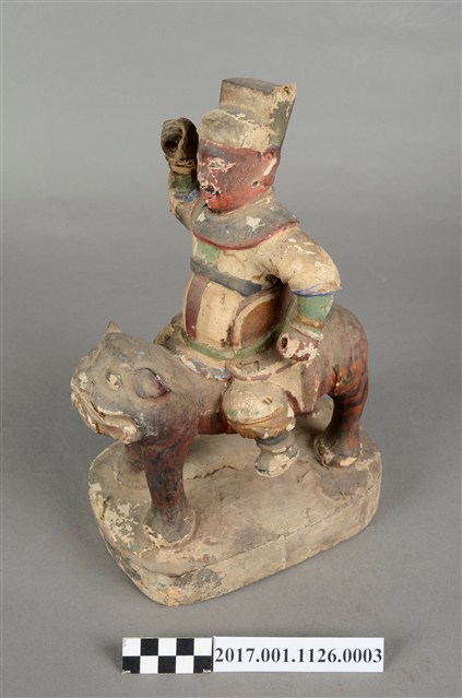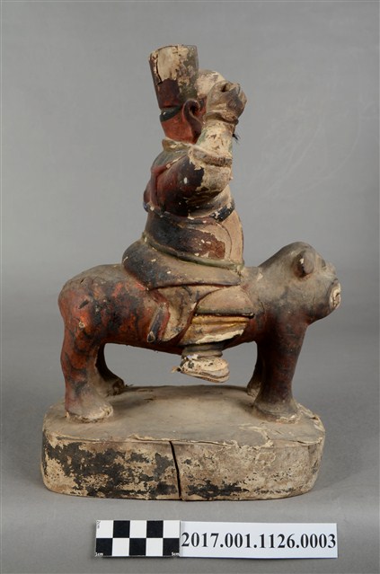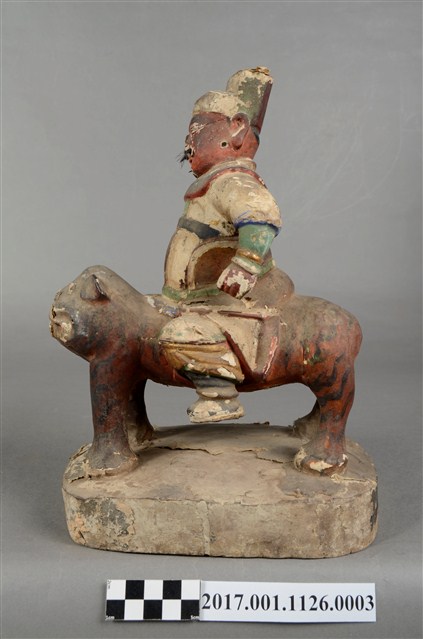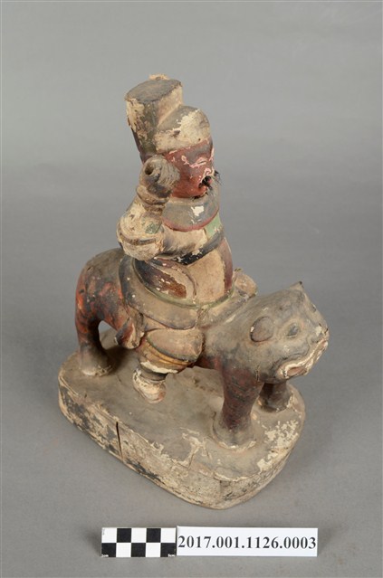 1.本件木雕騎虎尊王像跨坐虎背,皮面施以粉雕、彩繪與安金製成,粧佛大部分除去。尊王朱紅方臉,嘴部及兩腮蓄鬚,鬍鬚脫落,雙目半睜,表情慈祥,臉部稍有斑駁痕跡。頭戴幞頭,身穿甲袍,原有粧佛已除去,腳穿皂靴。左手低握持物,持物遺失,右手握拳高舉於頭部右側,跨坐於黃虎背上。黃虎頭大身小,四足踏於臺座上,嘟嘴微露門牙,向上抬望,臉部表情憨厚可愛,尾部斷裂遺失。臺座作方圓矮臺。