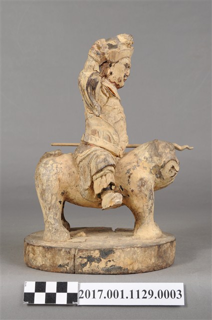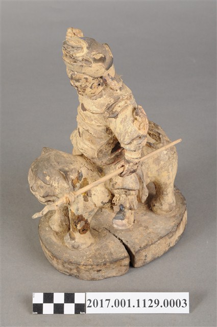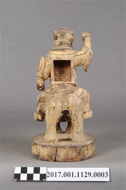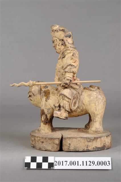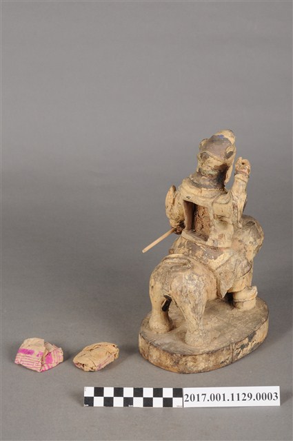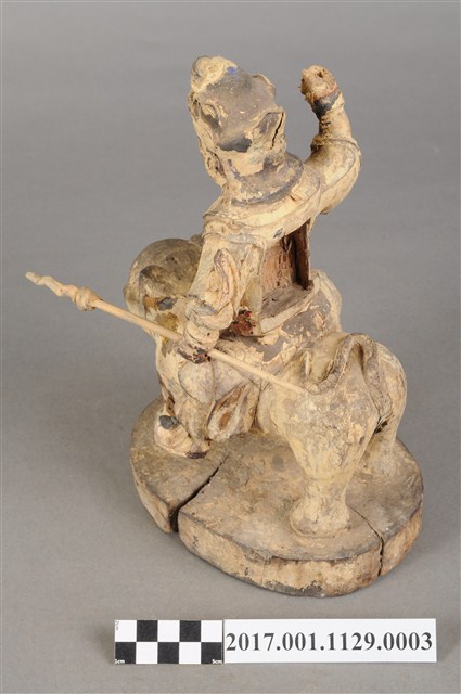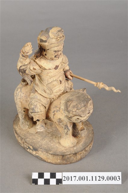 1.本件木雕張桓侯像,作騎虎姿態,表面粧佛剝落,背面開有方形入神洞,封榫缺損,但內容物件尚存,入神物目測有紙錢,紙錢一腳的版印紋飾推測為壽金。臉型輪廓呈橢圓形,皺眉,鳳眼,鼻翼兩側、唇下、下顎、兩頰有植鬚孔,鬍鬚已斷裂脫落。頭戴兜鍪,兜鍪上有雕刻獸頭,肩頸披著披膊與護肩,腰束腰帶,護腹以看帶、束腰固定,束腰下有左右擋鎧甲,腳穿皂靴。挺身跨坐於虎背上,左手向下握長矛,右手握拳持物高舉,持物已失,右手臂因擺動而使衣袖向後揚起。虎頭向前,凸眼,緊抿著虎嘴,四足踏著臺座。