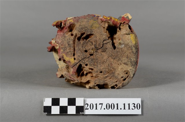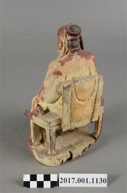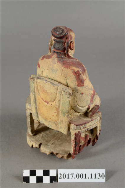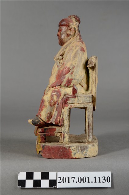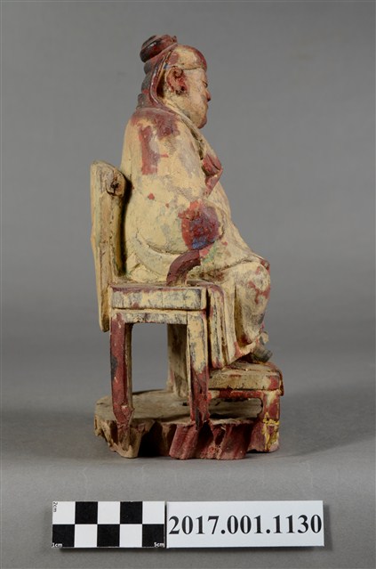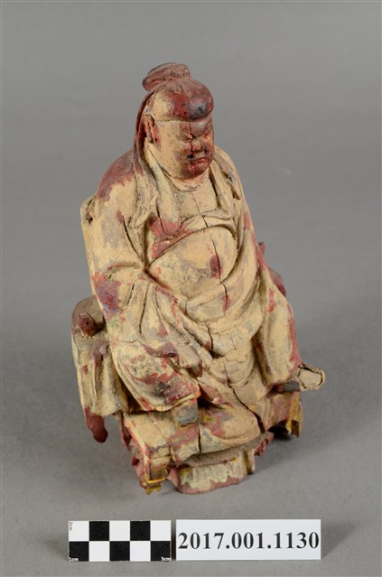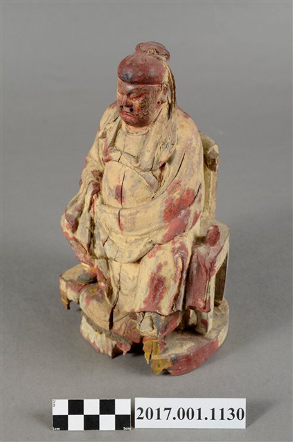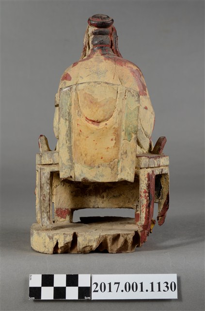 1.本件木雕關聖帝君像,作坐姿姿態,表面粧佛已褪去。臉型輪廓橢圓,皺眉,鳳眼,顏面有植鬚孔。頭戴軟巾,身著寬袖盤領衣,肚腹圓凸頂著看帶,腳穿皂靴,坐於圈背椅上。挺身端坐,雙足垂下,右腳向內縮,左手右伸,雙手藏於衣袖內環抱於腰際,作抱壽(袖)體(通壽體)姿勢。圈背椅的椅背披著坐布,圈背椅的扶手損毀,椅前有踏几。椅下的臺座呈圓形。