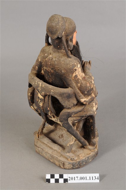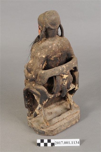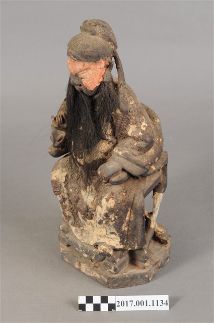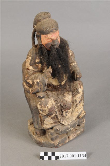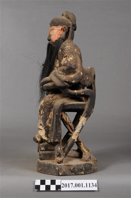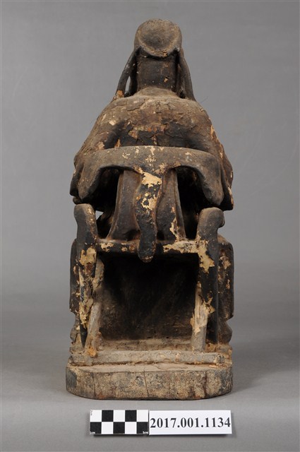 1.本件木雕關聖帝君像,作坐姿姿態,表面施作塗裝、安金不見紅粉線盤飾粧佛技法,安金已薰黑。臉型輪廓呈方形,皺眉,雙眼半睜,鼻翼兩側、下顎、兩頰蓄五柳長髯。頭戴軟巾,兩條巾帶垂於肩上,身著盤領衣,盤領衣粉線盤飾蟒、海水、雲紋,肚腹圓凸,腰束玉帶,腳穿皂靴,坐於圈背椅上。挺身端坐,右手舉起伸食指與小指收三指,左手放掌置於扶手出頭上。圈背椅的椅背披著獸皮,椅前有踏几。