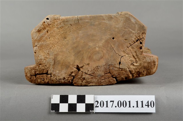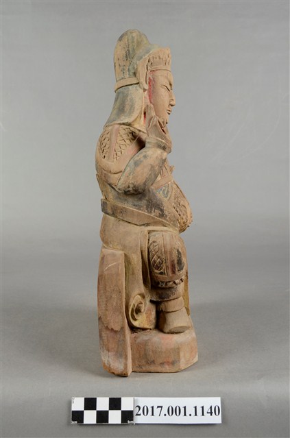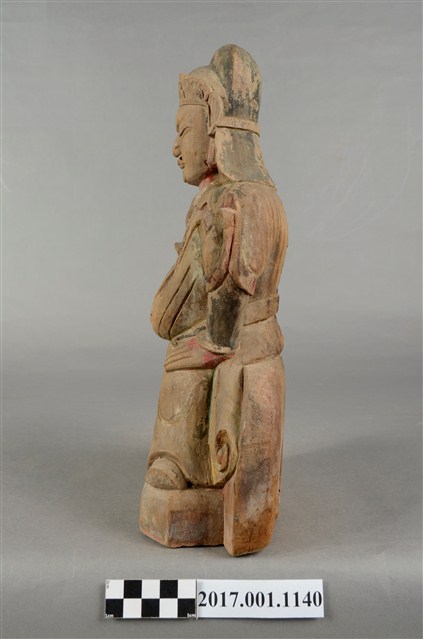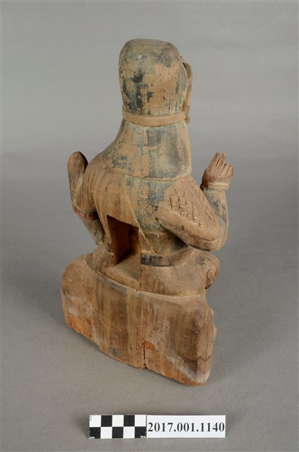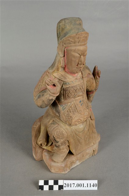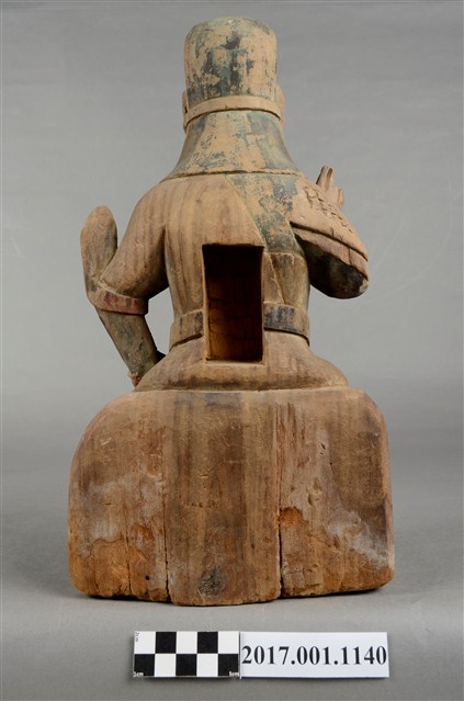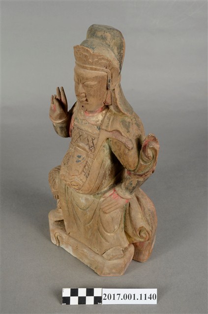 1.本件木雕關聖帝君像,作坐姿姿態,坐於椅凳上,粧佛已除去,殘留臉部外圍、頸部朱紅色與袍服墨綠色,背後開有長方形入神洞,封榫佚失,內部物件已取出。臉型輪廓橢圓,鳳眼,雙眼半睜,顏面有植鬚孔,鬍鬚已失。頭披軟巾戴兜鏊,身著甲袍,露出胸腹及右膝鎧甲,腰束革帶,腹部護甲雕飾獸頭,腳穿皂靴。挺身端坐,左手扶於左膝上,右手小臂上舉,結劍指訣作拂髯姿勢。左腳向左方外推,右腳內縮,作「文武腳」坐姿。臺座作六邊形,踏几前方雕如意紋。