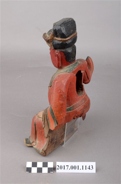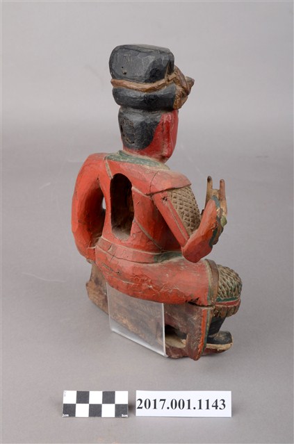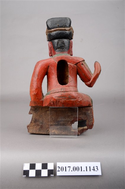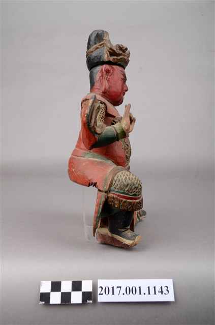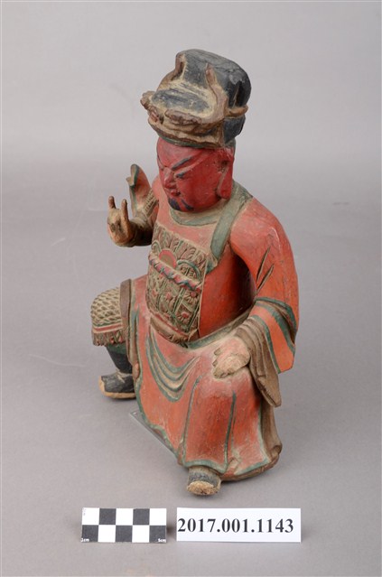 1.本件木雕關聖帝君像,作坐姿姿態,表面作錦雕、塗裝粧佛技法,頭部後方及背面開有橢圓形入神洞,其中背面內容物件已取出,頭部後方封榫尚存。臉型輪廓呈方形,皺眉,雙眼半睜,墨線彩繪鬍鬚。頭戴幞頭,身著鎧甲,腰束腰帶,腳穿皂靴。挺身端坐,左腳自然垂下、右腳內縮,右腳露出右擋鎧甲,右手伸食指與小指收三指,左手放掌置於左腿。本件屬於「脫椅」作法,臺座已失。