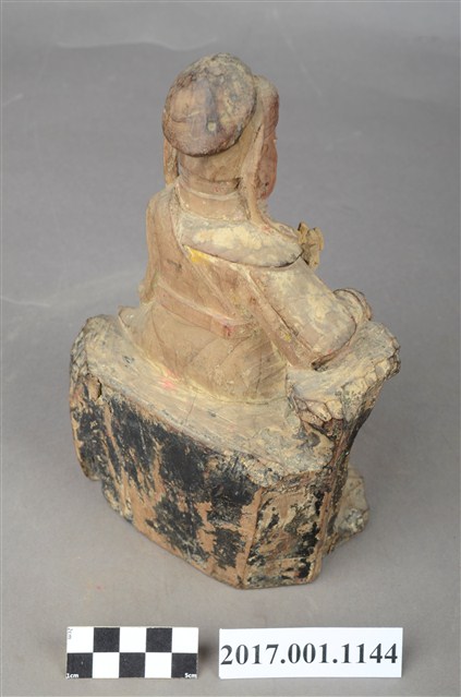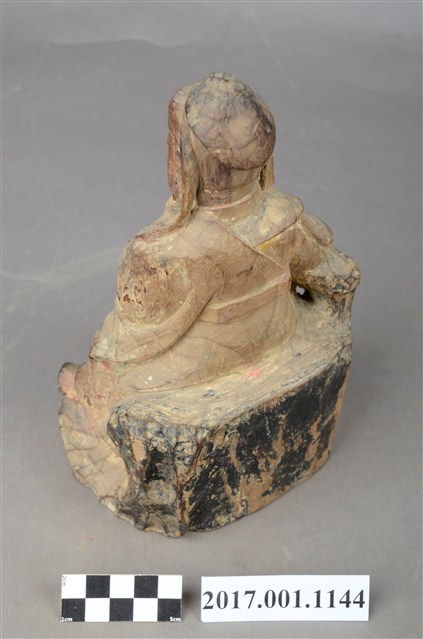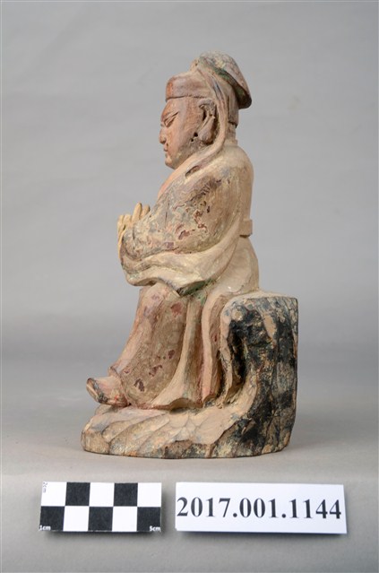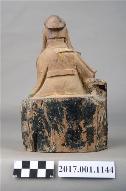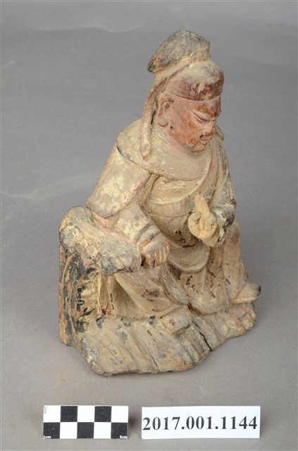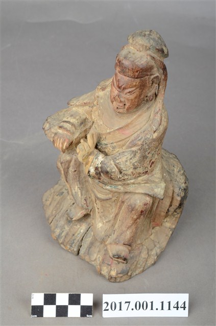 1.本件木雕關聖帝君像,作坐姿姿態,表面粧佛已褪去。臉型輪廓呈橢圓形,皺眉,鳳眼,鼻翼兩側、下唇、下顎、兩頰有植鬚孔,鬍鬚已斷裂脫落。頭戴軟巾,巾帶垂至兩肩上,身作「衷甲」式的裝束,亦即身著鎧甲,鎧甲外套著盤領衣,露出右肩的披膊與護肩,腳穿皂靴,坐於岩座上。挺身端坐,左腳向斜前方外推、右腳向內縮,作「文武腳」坐姿,左手橫伸手指作劍訣指訣,右手倚於身右憑几上。