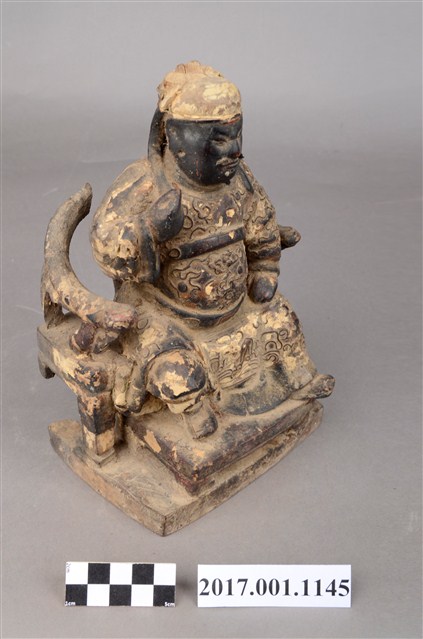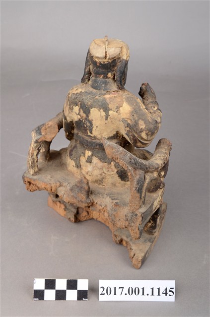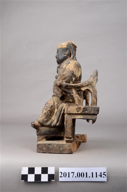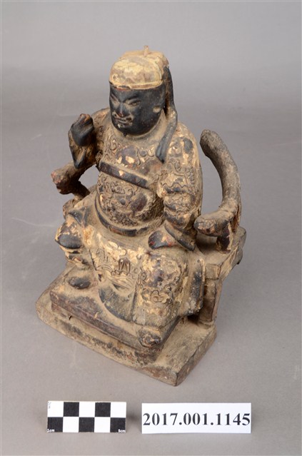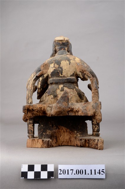 1.本件木雕關聖帝君像採坐姿,端坐於圈背椅上,表面施以漆線工法粧佛。關聖帝君臉色燻黑,皺眉,雙目半睜,鼻頭凸出,神情莊嚴。頭戴頭巾,頭巾有部分磨損,身穿圈領寬袖長袍,腰束玉帶,胸前有看帶,漆線盤飾龍搶珠紋,腳穿皂靴。左手扶於左膝,右手抬舉,持物遺失,左腳向外略伸出,右腳內縮,作文武腳姿態。椅前置踏几,圈背椅背後、扶手與臺座後半部斷裂。臺座作矮方臺。