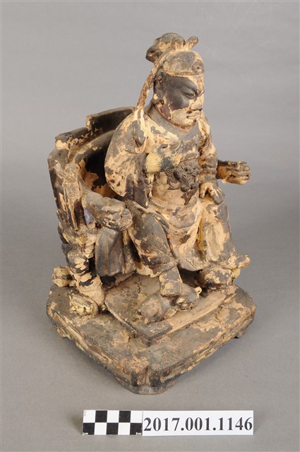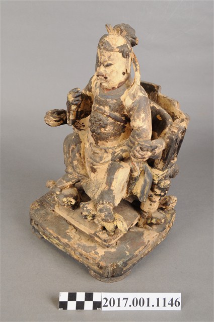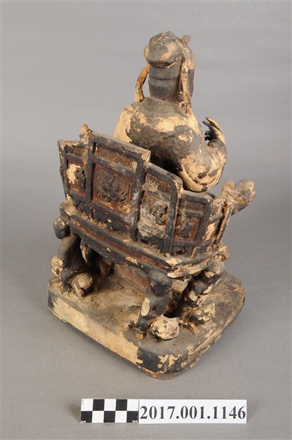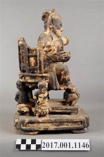 1.本件木雕關聖帝君像,作坐姿姿態,坐於屏椅上,表面施作塗裝、安金不見紅粉線盤飾粧佛技法,表面已薰黑。臉型輪廓呈橢圓形,皺眉,雙目半睜,顏面有植鬚孔。頭戴軟巾,巾帶垂至兩肩上,身作「衷甲」式的裝束,亦即身著鎧甲,鎧甲外套著盤領衣,盤領衣粉線盤飾蟠龍、雲紋,肚腹圓凸,腹下束腰帶,胸前有看帶,腳穿皂靴。挺身端坐,左腳向斜前方外推、右腳向內縮,作「文武腳」坐姿,右腳露出右擋鎧甲,兩腳各蹬獸座,右手舉起作捧鬚狀,左手置於腿上。屏椅的背屏表現蟠龍紋,屏椅的四足皆表現騎獸童子扛著座椅,扶手的出頭表現龍頭,屏椅前有踏几。