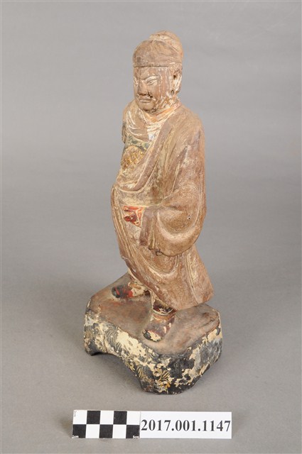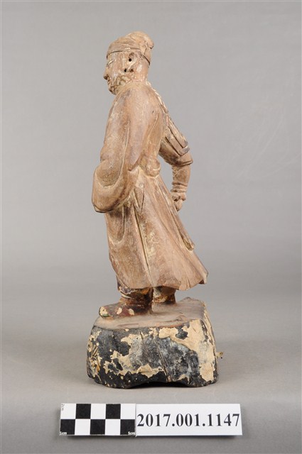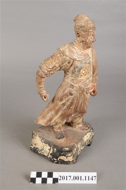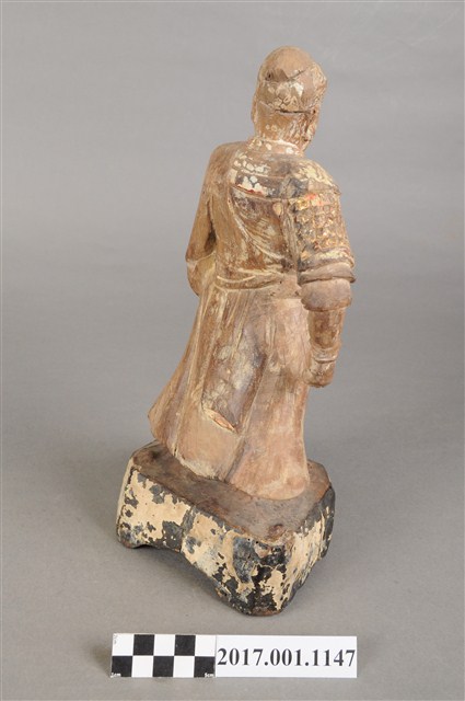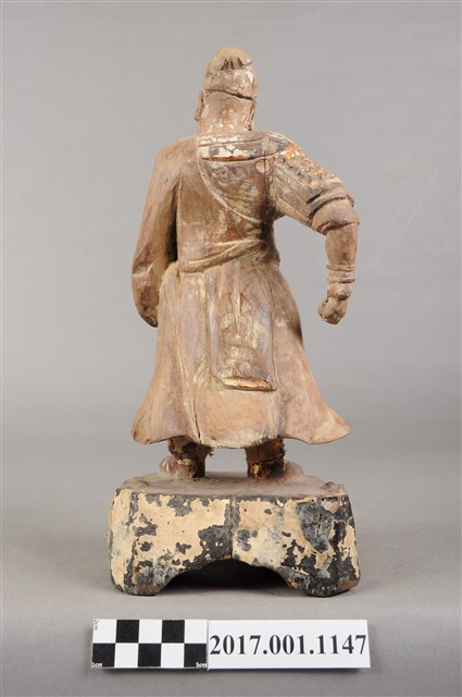 1.本件木雕關聖帝君像,作立姿姿態,表面粧佛已褪去。臉型輪廓呈橢圓形。頭部微側向左,皺眉,雙目半睜,鼻翼兩側、下顎、兩頰有植鬚孔,鬍鬚已斷裂脫落。頭戴軟巾,身作「衷甲」式的裝束,亦即身著鎧甲,鎧甲外套著袍服,腳穿皂靴。立像挺身以雙足丁字步的姿態站於臺座上,左手握腰帶,右手向下握拳持物,持物已失。臺座呈現案几形式,座前下方彩繪花草紋。