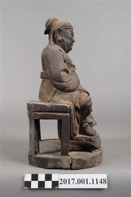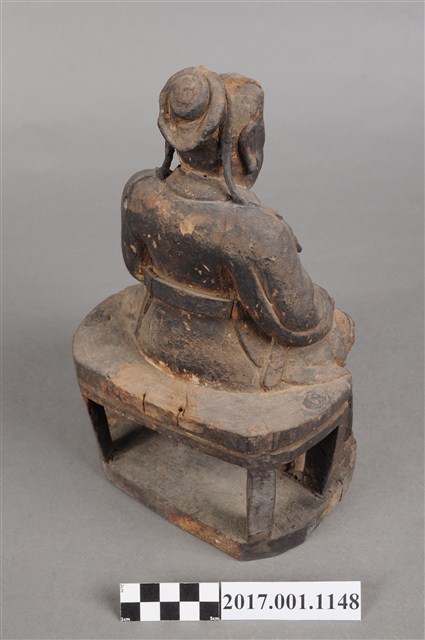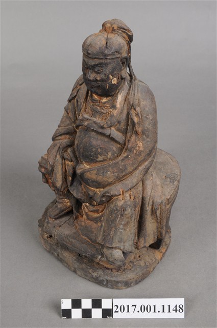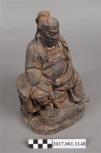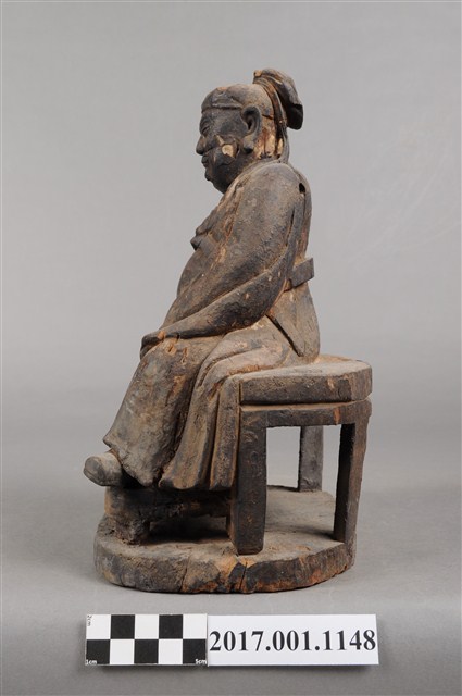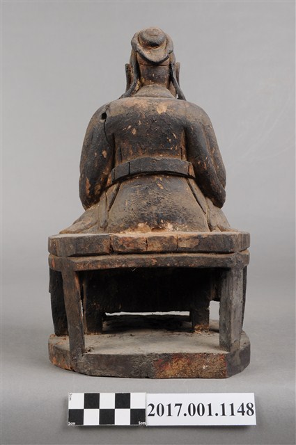 1.本件木雕關聖帝君像,作坐姿姿態,坐於圈椅背上,通身外觀薰黑。臉型輪廓橢圓,鳳眼,顴骨凸出,顏面有植鬚孔,鬍鬚已失。頭戴軟巾,巾的兩道帶垂至兩肩上,身作「衷甲」式的裝束,亦即身著鎧甲,鎧甲外套著寬袖盤領衣,肚腹圓凸頂著腰帶,腳穿皂靴。挺身端坐,雙足垂下,左腳向斜前方外推、右腳向內,作「文武腳」坐姿,左手右伸,雙手藏於衣袖內環抱於腰際,作抱壽(袖)體(通壽體)姿勢。圈背椅的的扶手損毀,椅前有踏几。