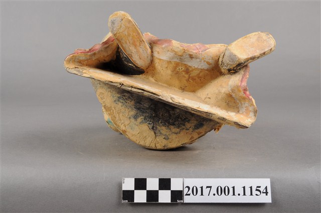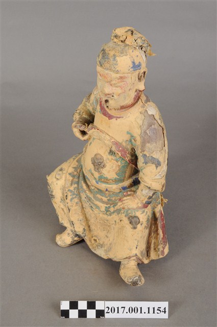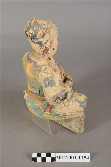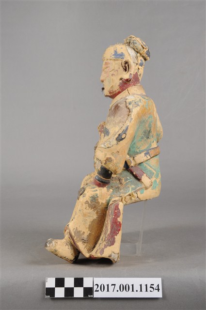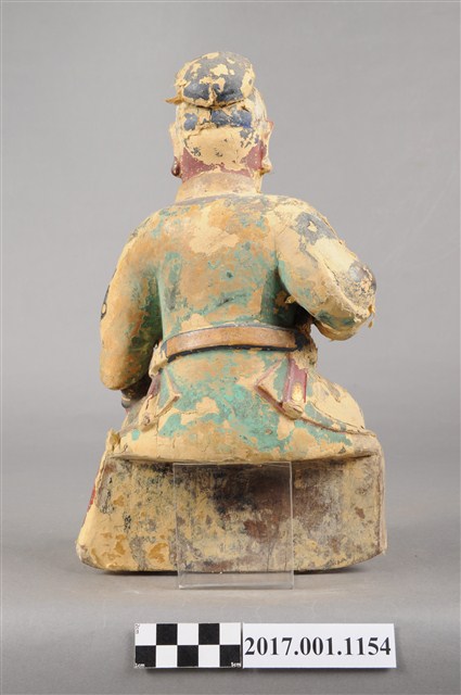 1.本件木雕關聖帝君像,作坐姿姿態,表面施作塗裝、安金不見紅粉線盤飾粧佛技法,粧佛大多褪去。臉型輪廓呈方形,皺眉,鳳眼,鼻翼兩側、下唇、下顎、兩頰有植鬚孔,鬍鬚已失。頭戴軟巾,身著盤領衣,肚腹圓凸,腹下束腰帶,胸前有看帶,腳穿皂靴。挺身端坐,左腳向斜前方外推、右腳向內縮,作「文武腳」坐姿,右手舉起握看帶,左手放掌置於腿上。本件屬於「脫椅」作法,臺座已失。