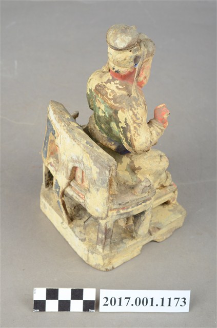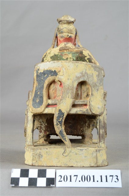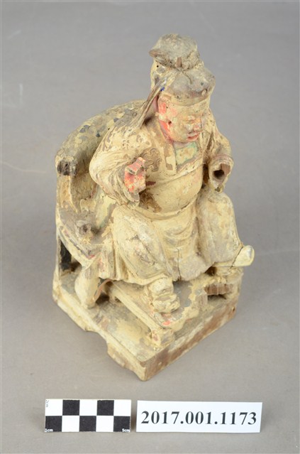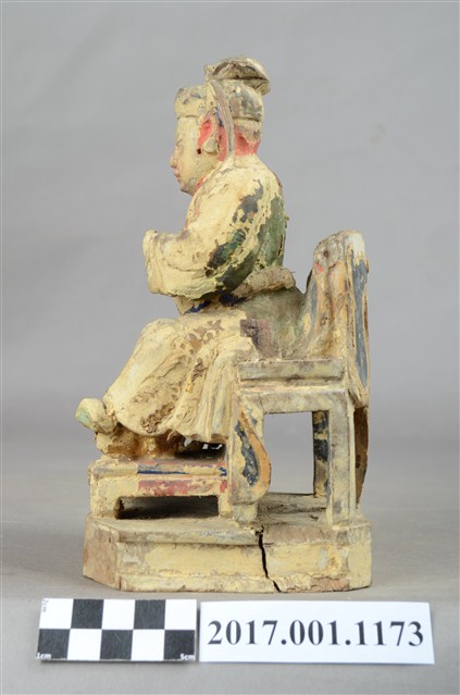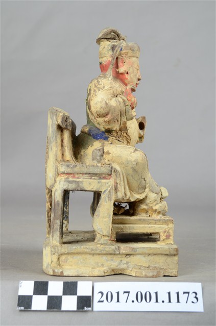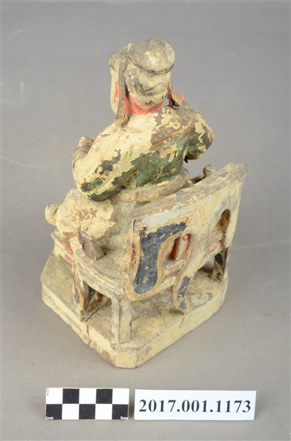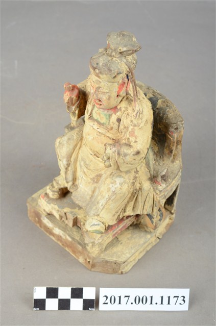 1.本件木雕關聖帝君像,作坐姿姿態,坐於圈背椅上,表面粧佛已褪去。臉型輪廓呈橢圓形,皺眉,雙眼半睜,鼻翼兩側、下顎、兩頰有植鬚孔,鬍鬚已失。頭戴軟巾,巾帶垂至兩肩上,身著鎧甲,鎧甲外套著盤領衣,肚腹圓凸,腹下束腰帶,胸前有看帶,腳穿皂靴。挺身端坐,兩足垂下,兩腳各蹬獸座,右手舉起作捧鬚狀,右手小臂前伸,手掌缺損。圈背椅的椅背披著獸皮,圈背椅的扶手損毀,椅前有踏几。