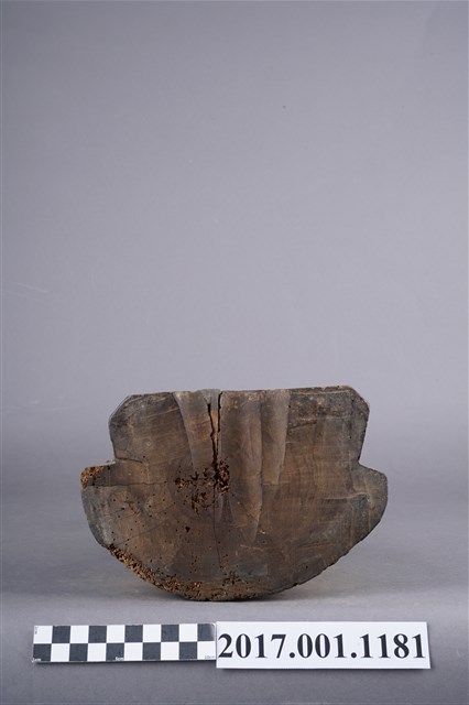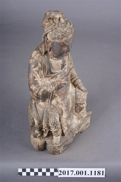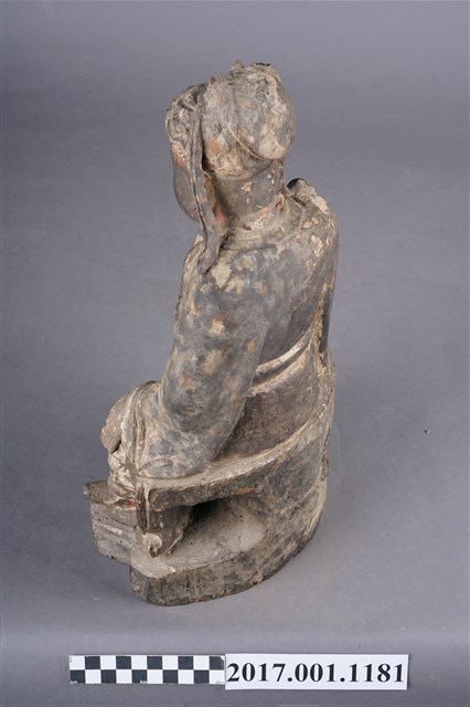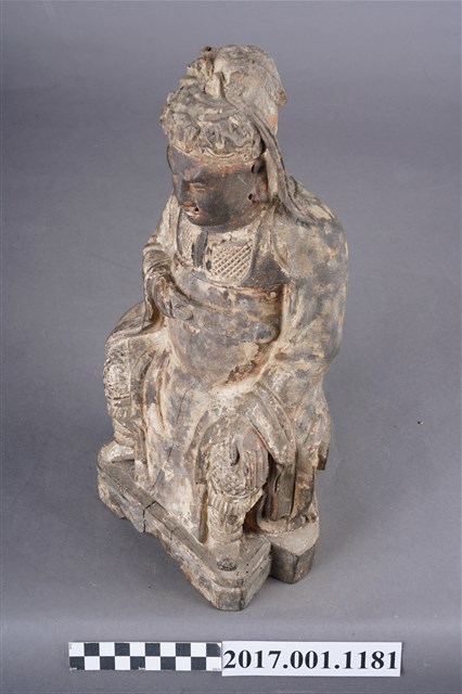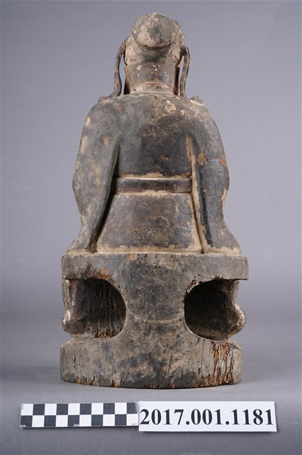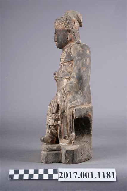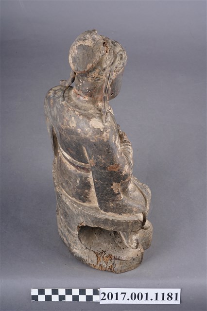 1.本件木雕關聖帝君像,作坐姿姿態,表面粧佛已褪去。臉型輪廓呈橢圓形,皺眉,鳳眼,鼻翼兩側、下顎、兩頰有植鬚孔,鬍鬚已失。頭戴軟巾,巾帶垂至兩肩上,身著鎧甲,鎧甲外套著盤領衣,腰束腰帶,腳穿皂靴。挺身端坐,腳露出左右擋鎧甲,右手舉起握腰帶,左手放掌置於腿上。