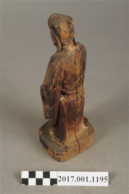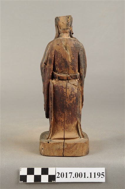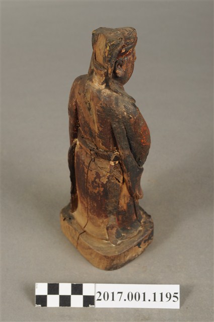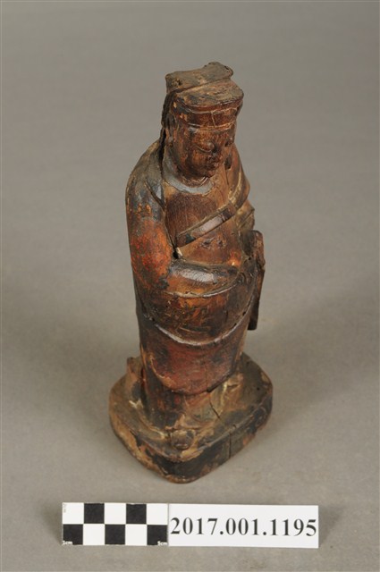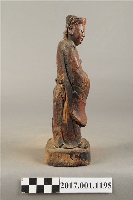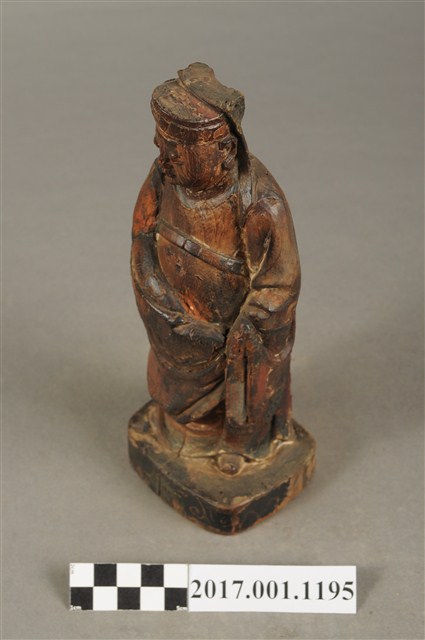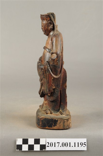 1.本件木雕關平像,作立姿姿態,表面粧佛已褪去。臉型輪廓橢圓。頭部微側向右,雙目半睜,眉目清秀,表現年輕男性的相貌。頭戴圓巾,巾帶垂至兩肩上。身著盤領衣,腰束腰帶,雙腳穿皂靴。立像挺身以雙足八字步的姿態站於臺座上,右手左伸,雙手藏於衣袖內環抱於腰際,作抱壽(袖)體(通壽體)姿勢。關平多作捧印形象,仍有少數會作抱袖體,例如臺南祀典武廟之關平像。