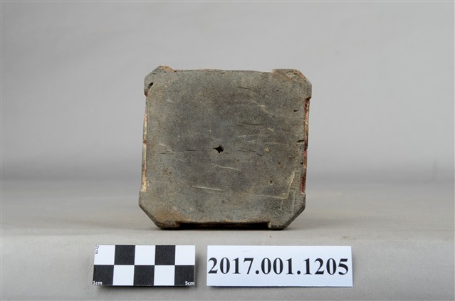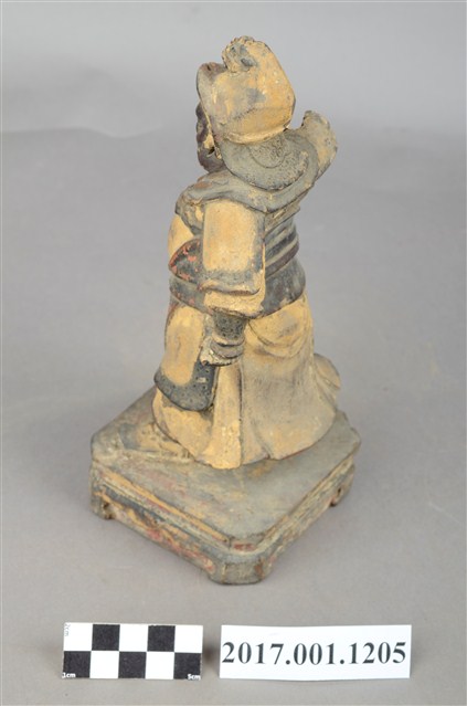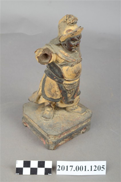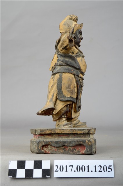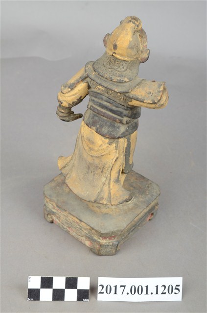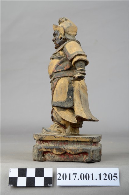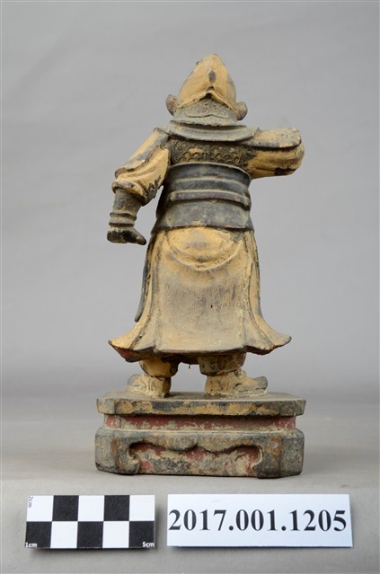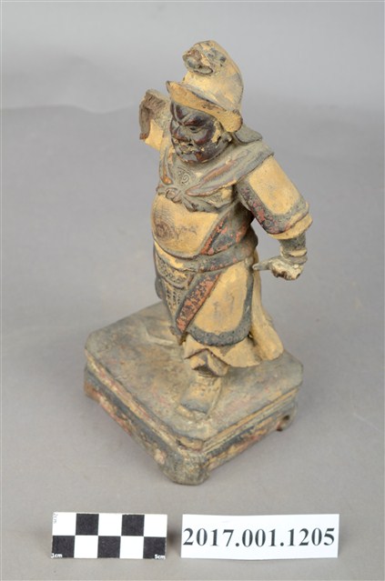 1.本件木雕周倉像,作立姿姿態,表面施作塗裝粧佛技法,局部漆面剝落。臉型輪廓方正。頭部微側向左,皺眉,雙眼瞠目,顴骨凸出,嘴微開,表現壯年男性嚴肅的相貌。鼻翼兩側、唇下、下顎、兩頰旁皆有植鬚孔,鬍鬚已斷裂脫落。頭戴兜鍪,上半身著盤領衣、下半身著長褲,肩頸披著披膊與護肩,腰束腰帶,護腹以腰帶固定,正面腰帶下有前擋鎧甲,鎧甲以錦雕表現甲冑紋,雙腳穿皂靴。立像挺身以雙足丁字步的姿態站於臺座上,左手放掌向下,右手上抬,自手肘處斷裂損毀。臺座表現案几形式。