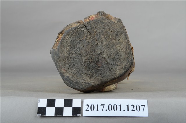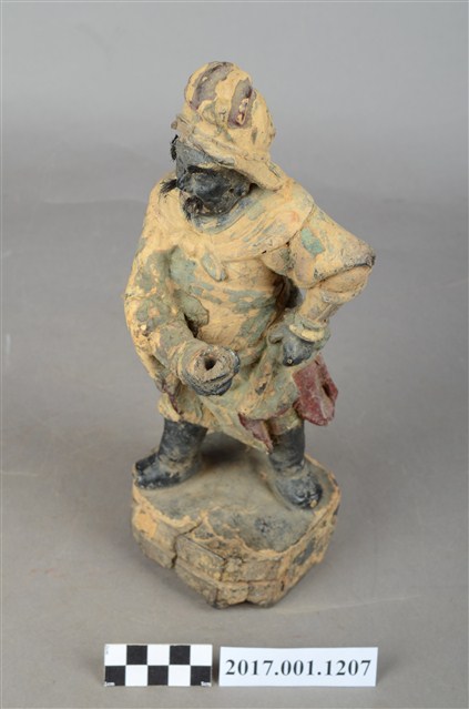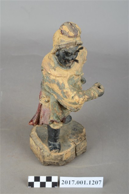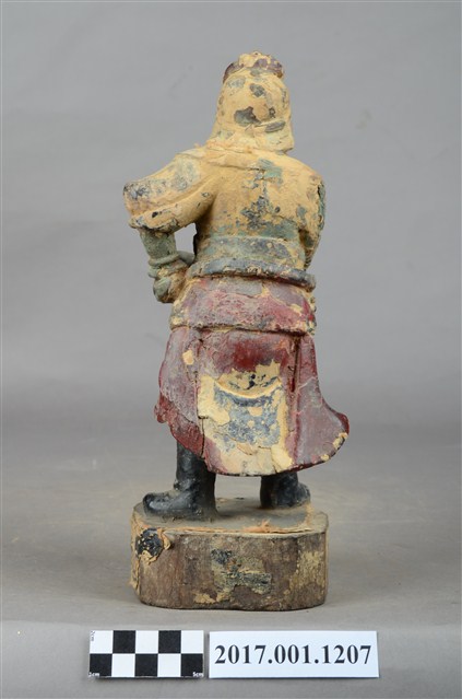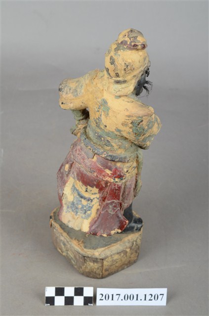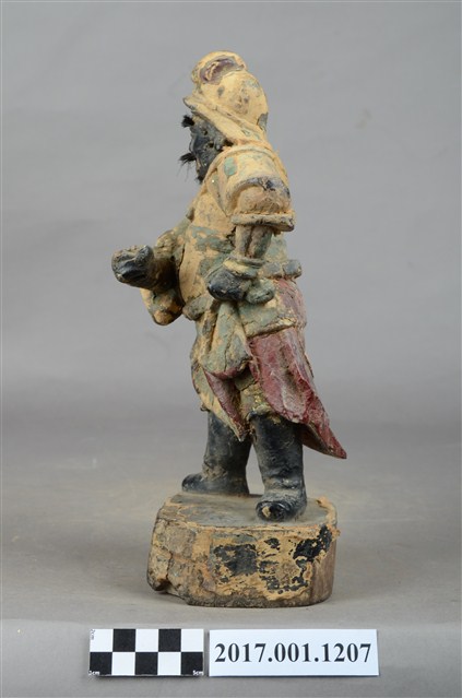 1.本件木雕周倉像,作立姿姿態,表面粧佛已褪去,僅存顏面、背面保有平塗漆面。臉型輪廓呈長方形,頭部微側向右,皺眉,雙眼瞠目,下顎凸出,表現壯年男性嚴肅的相貌,眉骨、鼻翼兩側、下顎、兩頰旁皆有植鬚孔,部分眉鬚已失。頭戴兜鍪,上半身著盤領衣、領巾,下半身著長褲,肩頸披著披膊,腰束腰帶,護腹以腰帶固定,雙腳穿皂靴。立像挺身以雙足丁字步的姿態站於臺座上,左手插腰,右手左伸握拳持物,持物已失。臺座呈現案几形式。
