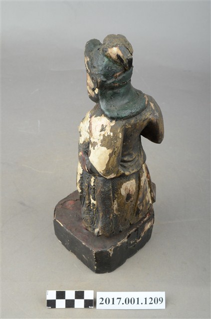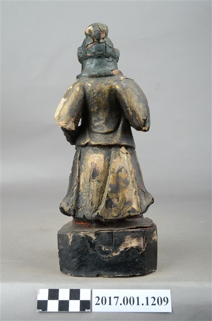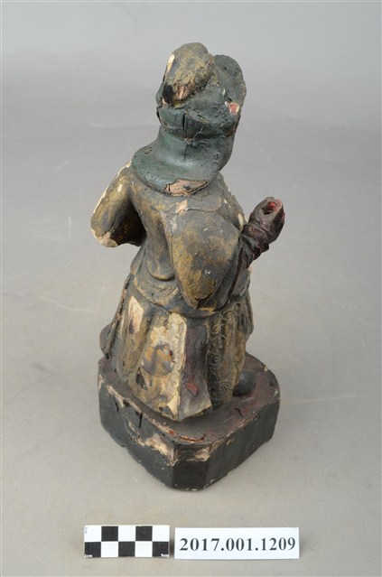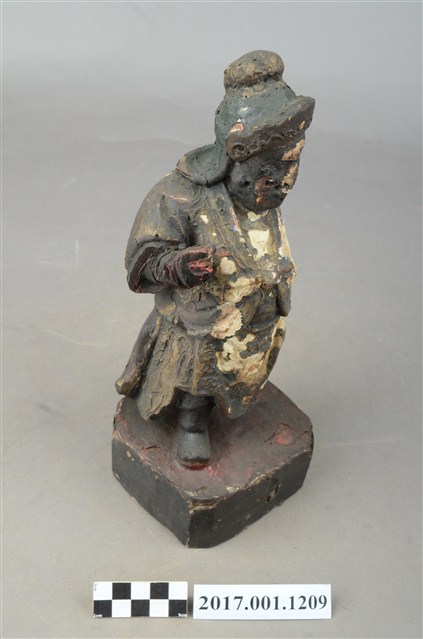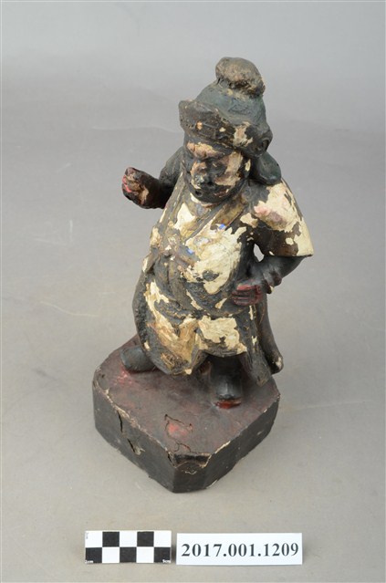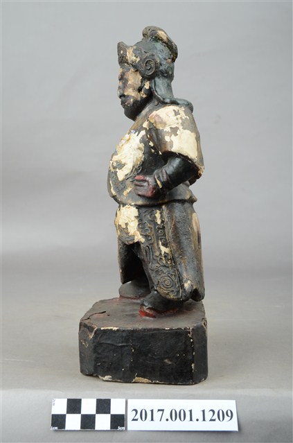 1.本件木雕周倉像,作立姿姿態,表面已薰黑。臉型輪廓橢圓。頭部微側向左,皺眉,雙眼瞠目,表現壯年男性嚴肅的相貌。鼻翼兩側、下顎、兩頰旁皆有植鬚孔,眉鬚已斷裂遺失。頭戴兜鍪,上半身著盤領衣、下半身著長褲,上半身套著罩衫,雙腳穿皂靴。立像挺身以雙足丁字步的姿態站於臺座上,左手插腰,右手小臂上舉握拳,持物已失。