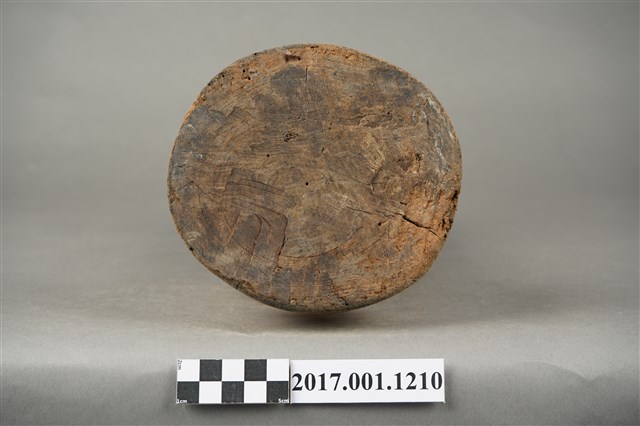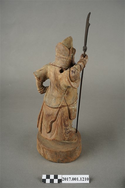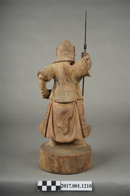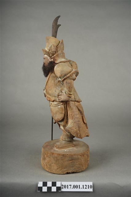 1.本件木雕周倉像,作立姿姿態,表面粧佛已褪去。臉型輪廓方正,皺眉,雙眼瞠目,顴骨凸出,嘴微開,表現壯年男性嚴肅的相貌,眉骨、鼻翼兩側、下顎、兩頰旁皆有植鬚。頭戴兜鍪,上半身著盤領衣、下半身著長褲,上半身套著罩衫,腰束腰帶,雙腳穿皂靴。身軀前傾,立像挺身以雙足八字步的姿態站於臺座上,左手插腰,右手高舉握關刀。臺座呈現圓形。