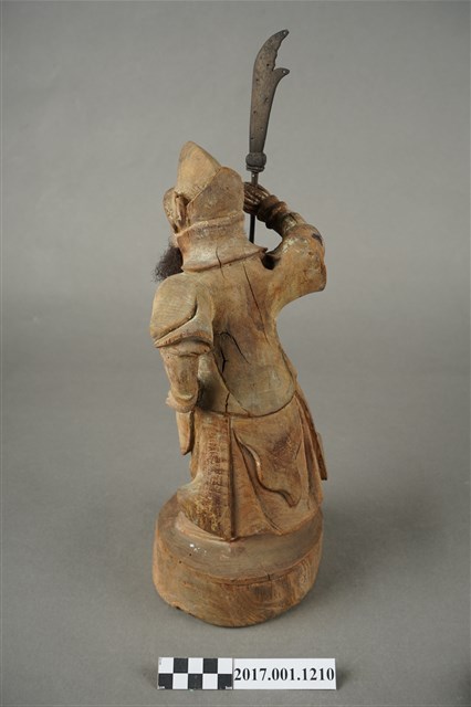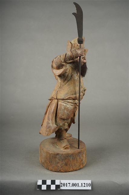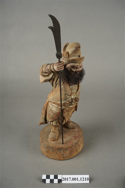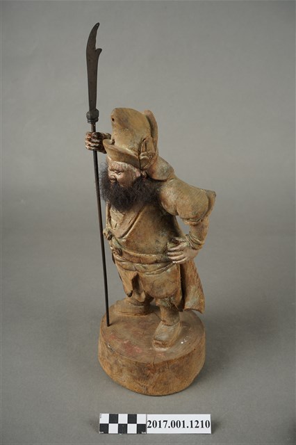 2.周倉是三國時期蜀漢將領關羽的部將,建安24年(219)關羽兵敗為吳軍擒殺,周倉於城上見關羽首級,乃自刎而死。周倉常與關平一同配祀於關聖帝君左右,關平位於關聖帝君左側、周倉位於右側,而宜蘭礁溪協天廟則為周倉位於關聖帝君左側,少數將周倉奉為主祀神如新北市萬里仁和宮,源自清光緒17年自野柳海岸撿拾到周倉神像。周倉的形象在《三國演義》中有所描述,作為關聖帝君的配祀神,常表現成手握青龍偃月刀。(富俐崴文化事業有限公司/謝宗榮計畫主持)