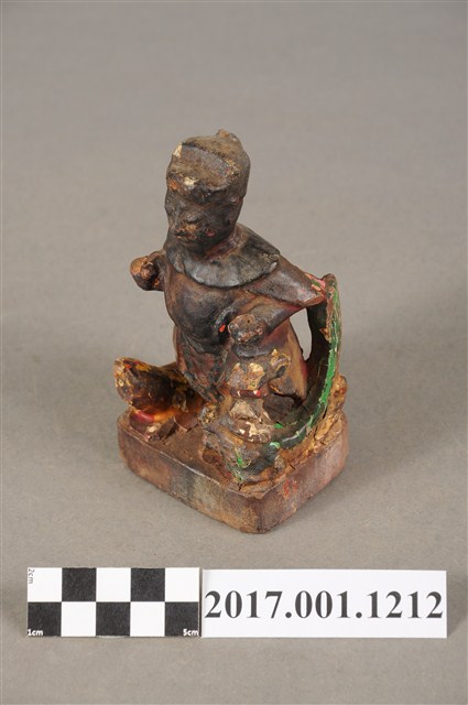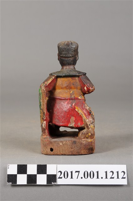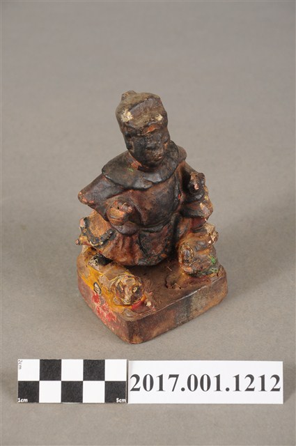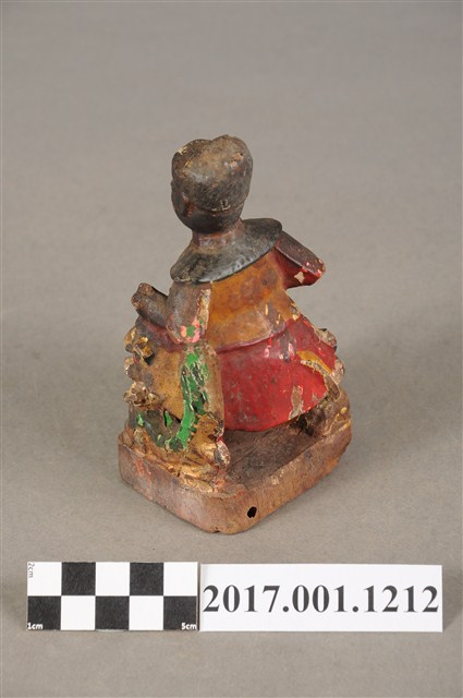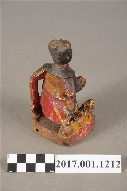 2.藥王即主管醫藥之神,佛教稱藥王菩薩,其名諱有多種說法,一說藥王為唐中宗時精通醫術之光祿卿韋訊,或說為唐武后時之章善俊,唐朝,奉道法。韋、章二人兩人皆流傳有攜黑犬隨行、施藥濟人之事蹟。亦有以為藥王為古代名醫扁鵲、華陀者。臺灣民間信仰以神農大帝為藥王,道教則以隋唐間之孫思邈為藥王,尊稱孫真人,流傳有醫龍眼、治虎喉之傳說。本件藥王神像較為近似孫思邈之造形。(富俐崴文化事業有限公司/謝宗榮計畫主持)