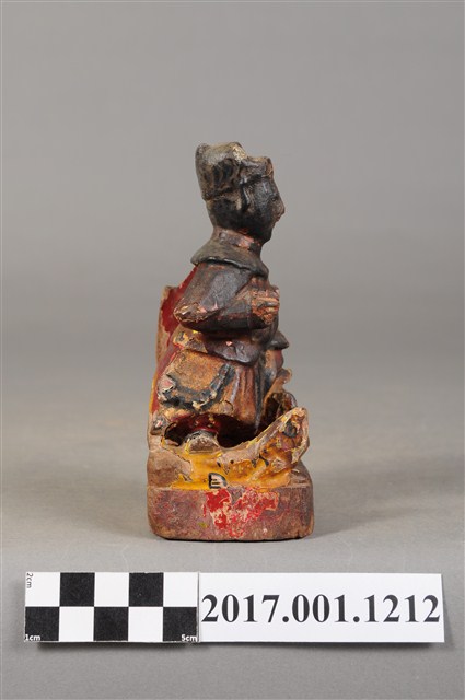 1.本件木雕藥王像作立姿,表面顏色呈紅褐色,臉部無鬚,作青年男子相貌,五官模糊不清。藥王頭戴幞頭,身穿長袍甲裙,肩上披披膊,腰間束護腰。雙手前舉握拳,所持物遺失。右腳踩青龍,左腳前有黃虎,以象徵醫龍眼、治虎喉之義,神獸表情模糊不清。臺座作方矮臺。