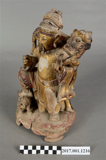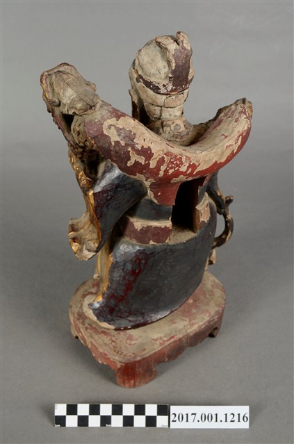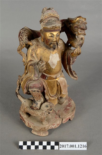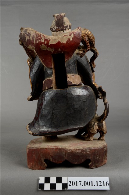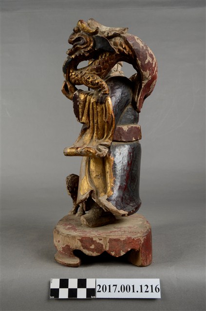1.本件木雕藥王像,作立姿態,表面施作塗裝、安金不見紅粧佛技法,粧佛局部剝落,背面開有長方形入神洞,封榫佚失,內部物件已取出。頭部後方也有長形入神洞,封榫尚存。臉型輪廓橢圓,頭部微側向右,雙眼圓炯有神,鼻翼兩側、下顎植鬚。頭戴翼善冠,身著寬袖盤領衣,胸前安金層剝落,腰束腰帶,腳穿皂靴。左腳在後踏臺座,右腳屈膝抬高踏在虎頭上,左手向上托著龍鬚,右手曲肘小臂前舉,五指相捻作持丹藥狀。藥王的背後有龍,虎四肢直立,抬頭望向藥王,龍與虎呼應藥王醫龍眼、治虎喉的傳說典故。