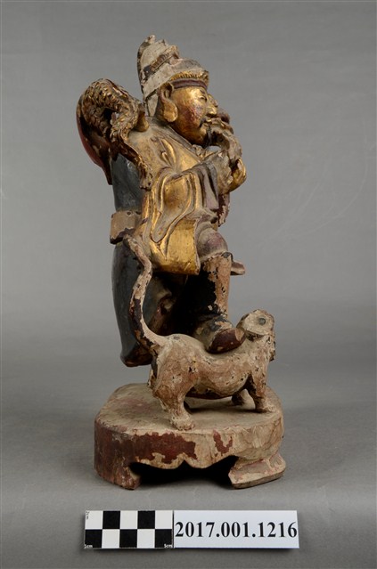 2.藥王即主管醫藥之神,佛教稱藥王菩薩,其名諱有多種說法,一說藥王為唐中宗時精通醫術之光祿卿韋訊,或說為唐武后時之章善俊,唐朝,奉道法。韋、章二人兩人皆流傳有攜黑犬隨行、施藥濟人之事蹟。亦有以為藥王為古代名醫扁鵲、華陀者。臺灣民間信仰以神農大帝為藥王,道教則以隋唐間之孫思邈為藥王,尊稱孫真人,流傳有醫龍眼、治虎喉之傳說。本件藥王神像較為近似孫思邈之造形。(富俐崴文化事業有限公司/謝宗榮計畫主持)