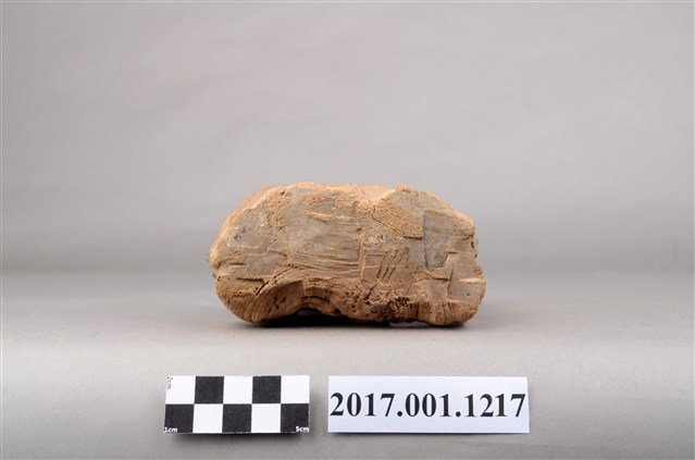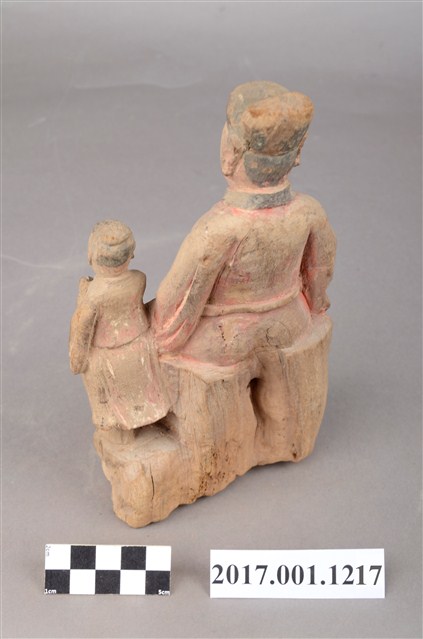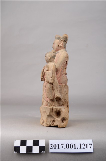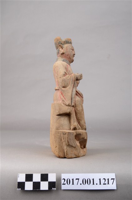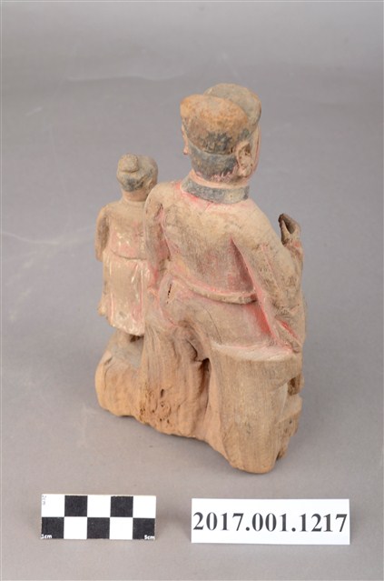 1.本件木雕藥王像,作坐姿姿態,表面粧佛已褪去。臉型輪廓橢圓,雙眼半睜,鼻翼兩側、下顎有植鬚孔,鬍鬚已失。頭戴幞頭,身著寬袖盤領衣,肚腹圓凸,腹下束腰帶,胸前有看帶,坐於岩座上。挺身端坐,雙足垂下,左手向下置於腿上,右手高舉。藥王左側有一童子,童子頭梳髮髻,臉型輪廓橢圓,身著右衽窄袖長袍,左手捧一物件,右手做護衛狀。