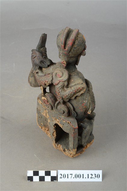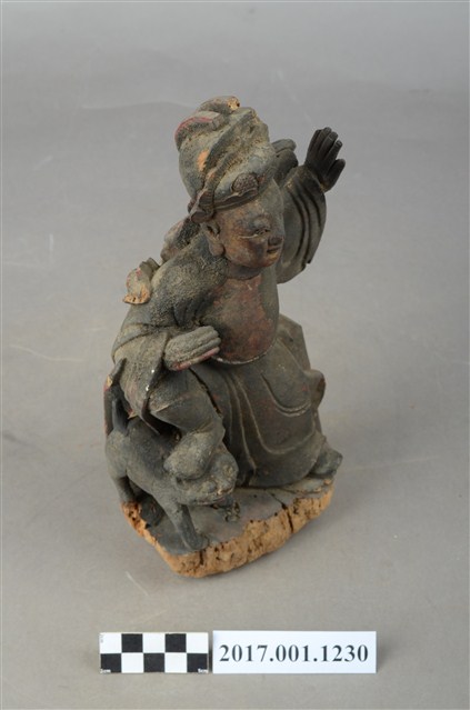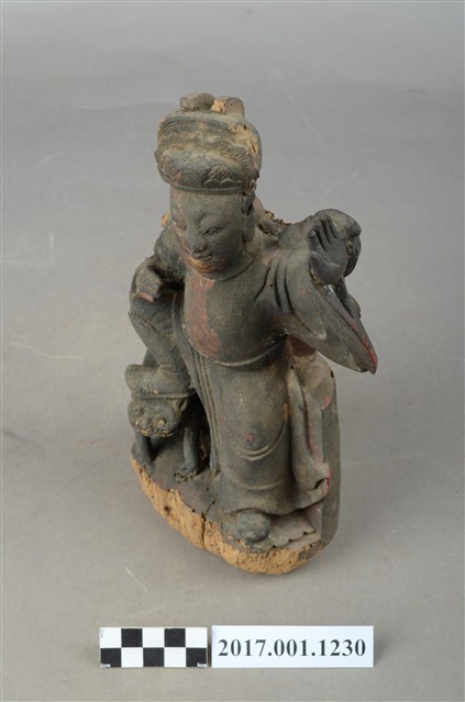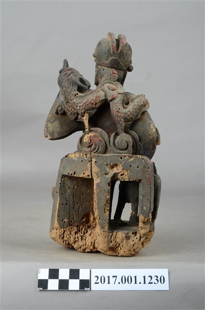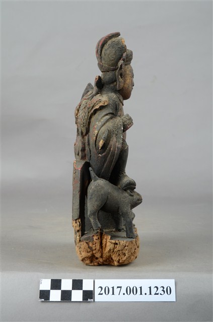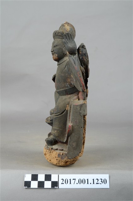 2.藥王即主管醫藥之神,佛教稱藥王菩薩,其名諱有多種說法,一說藥王為唐中宗時精通醫術之光祿卿韋訊,或說為唐武后時之章善俊,唐朝,奉道法。韋、章二人兩人皆流傳有攜黑犬隨行、施藥濟人之事蹟。亦有以為藥王為古代名醫扁鵲、華陀者。臺灣民間信仰以神農大帝為藥王,道教則以隋唐間之孫思邈為藥王,尊稱孫真人,流傳有醫龍眼、治虎喉之傳說。本件藥王神像較為近似孫思邈之造形。(富俐崴文化事業有限公司/謝宗榮計畫主持)
