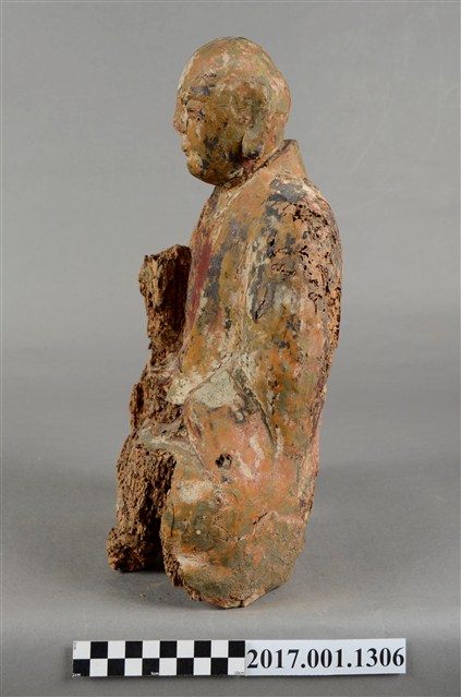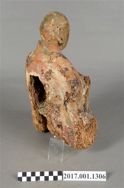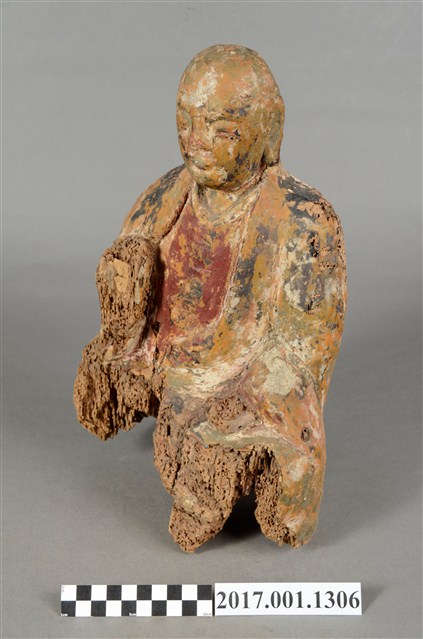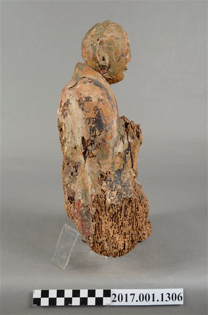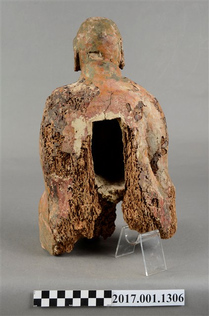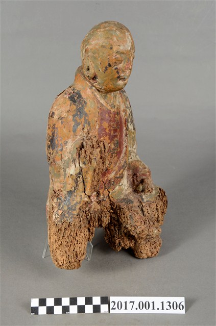 1.本件木雕阿彌陀佛像,作結跏趺坐姿態,背面開有長方形入神洞,封榫佚失,內容物件已取出,臺面蛀蝕嚴重,僅存部分平塗漆面。顏面表現青壯年比丘相貌,瞠目,山根塌、鼻樑短,顴骨凸出,身著雙覆肩式僧袍,雙手手臂受出水式衣紋覆蓋。雙手手掌蛀蝕,左手置於左膝上,右手高舉於胸前。本件判斷為阿彌陀佛,在於體態與扮相屬於佛的表現,手勢應為接引印,雖然無表現佛像常見的鏍髮與肉髻,但阿彌陀佛像有表現為成佛前的「法藏」比丘相。