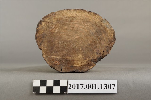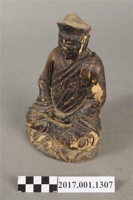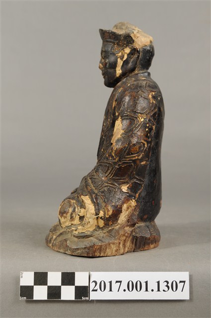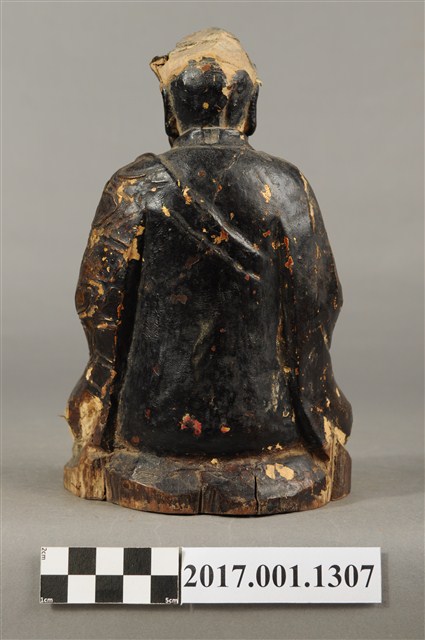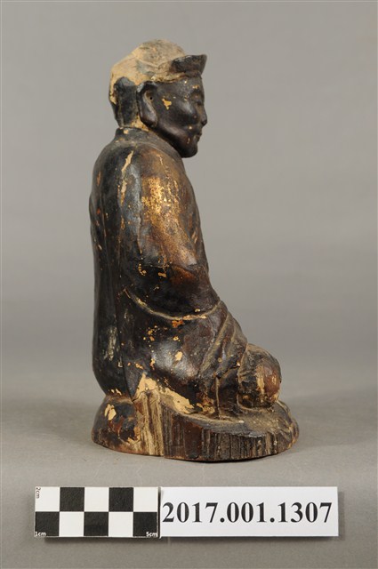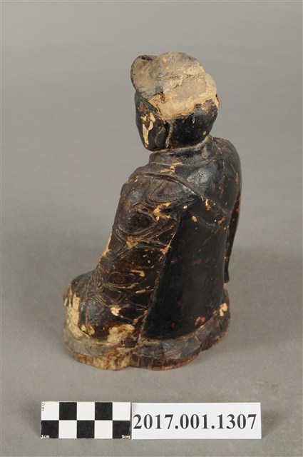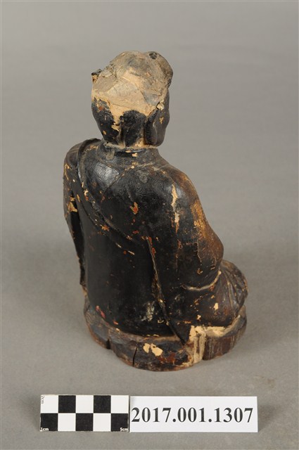 1.本件木雕定光古佛像,作結跏趺坐姿態,表面施作塗裝漆線盤飾,局部粧佛剝落。頭戴毘盧冠,顏面表現狀年比丘相貌,山根塌、鼻樑短,身著右衽寬袖僧袍,左肩綴著袈裟衣角坐於蒲團上。雙足盤腿,雙手相疊成禪定印置於腹前。蒲團下無臺座。