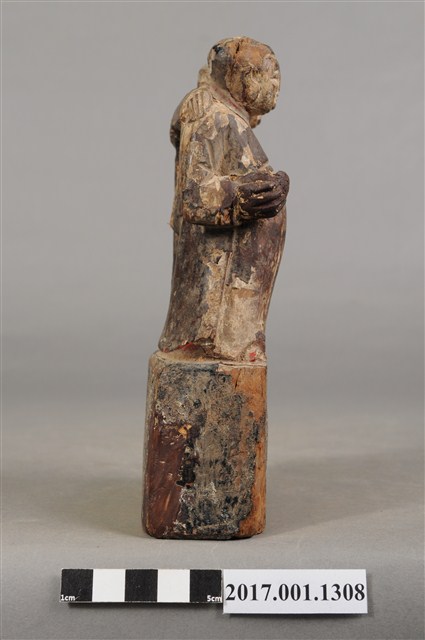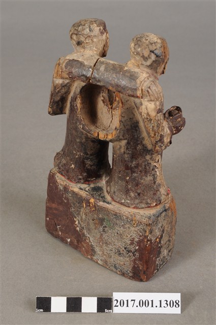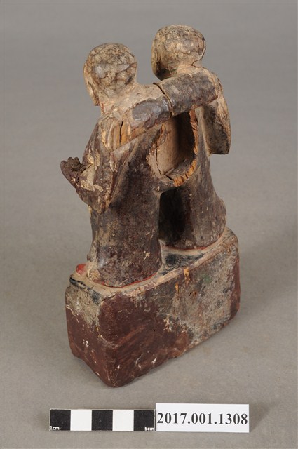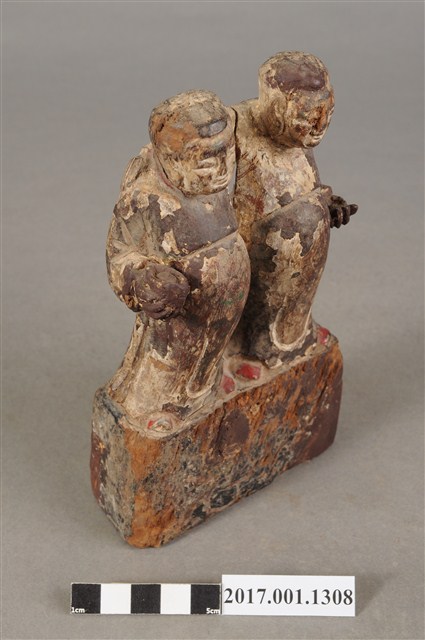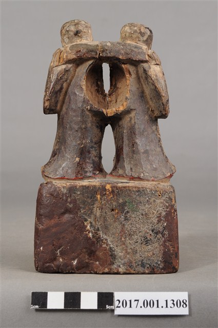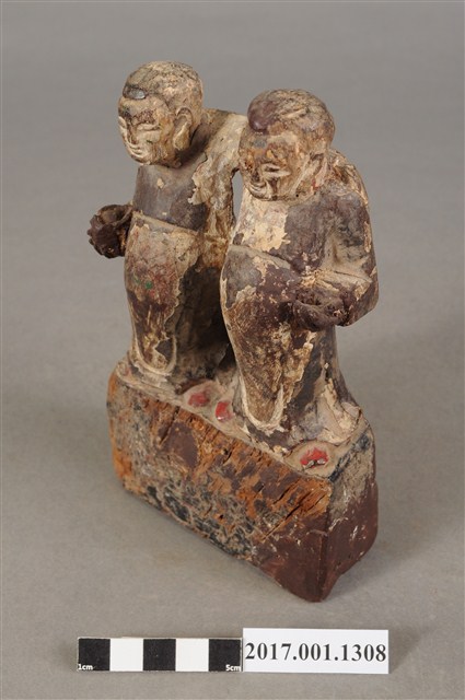 1.本件木雕和合二仙像,作立姿姿態,表面粧佛已褪去,背面開有圓形入神洞,內容物件已取出。臉型輪廓橢圓,短髮,雙目半睜,身著窄袖長袍,肚腹圓凸,兩位相擁,左側為合仙,左手向下持盒,右手搭於和仙肩膀,右側為和仙,右手向下持蓮花,左手搭於合仙肩膀。