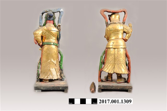 1.本件泥塑韋馱伽藍尊者像,二件一組,表面施作塗裝、安金不見紅粉線盤飾粧佛技法。韋馱尊者顏面表現青年相貌,伽藍尊者顏面表現壯年男性相貌,頭戴盔,身著鎧甲,披飄帶,腳套履。立像挺身以雙足丁字步的姿態站於木製方形臺座,伽藍尊者的持物已遺失。
