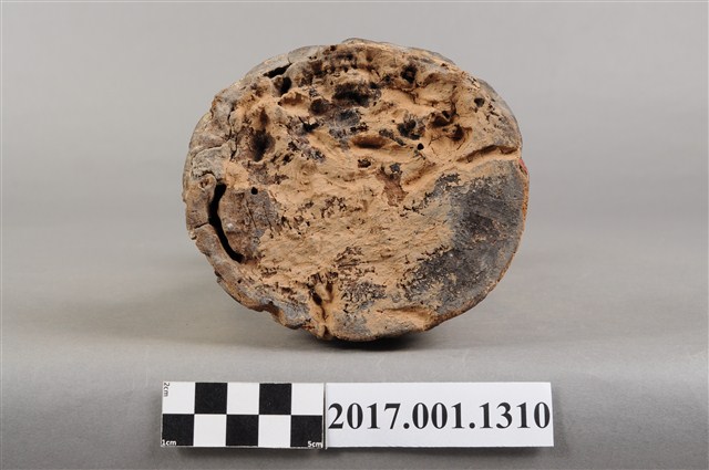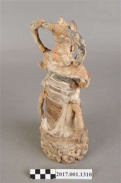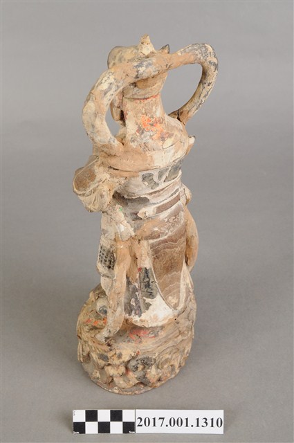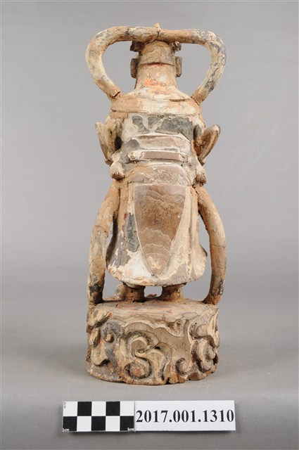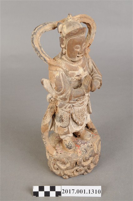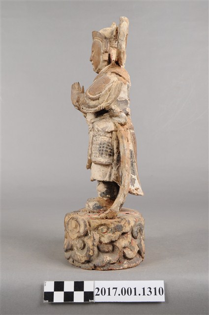 1.本件木雕韋馱尊者像,表面之粧佛大部分已除去,僅在背後、飄帶、臺座等部位殘留紅、黑等色。韋馱尊者作立姿像,頭部與身軀呈1:4比例,相貌作少年武將,身著寬袖過膝短衫、長褲,外罩鎧甲,頭戴兜鍪,腳著皂靴,頭部後方有飄帶環繞,飄帶兩端延伸到腿部兩側與雲座相接。雙眼平視,雙手合十於胸前,作問訊狀,雙腿平行站立,足跟分開,足尖向外微張,腳下臺座前方作雲朵紋雕飾。