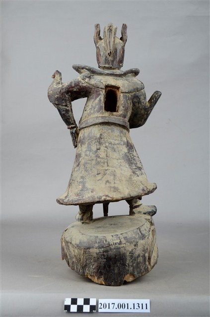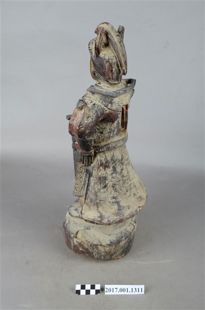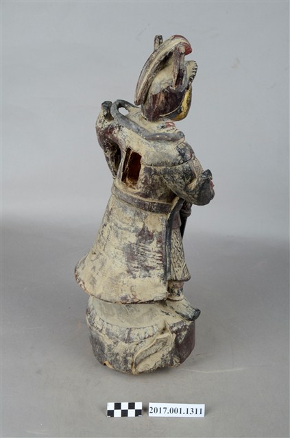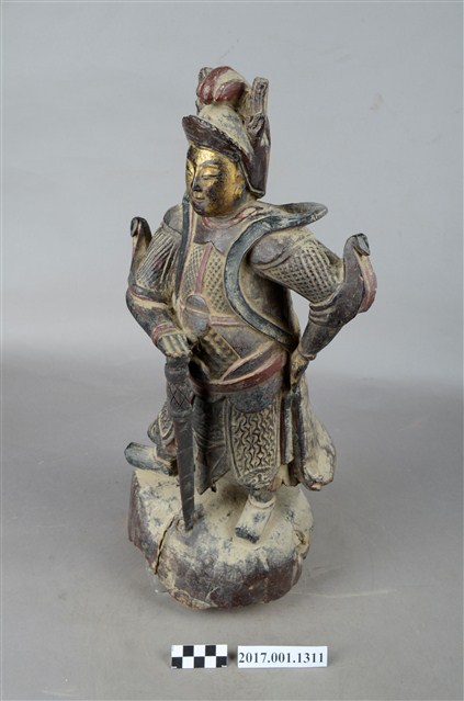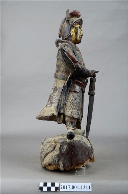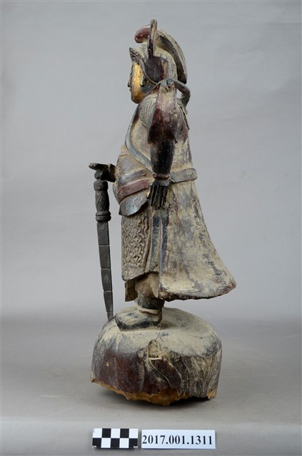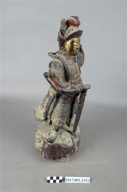 1.本件木雕韋馱尊者像,表面之安金大部分已褪去,殘留臉部安金與身軀紅、黑等色,背後開一長方形入神洞,洞內物件已取出。韋馱尊者作立姿像,相貌作少年武將,身著窄袖短衫,外罩鎧甲,頭戴盔,雙眼平視,左手扶於左腰處,右手小臂橫於腹前,手掌朝下按於身前金剛杵之柄端,作拄杵姿態。左腿直立,右腿往外方伸出,圓形臺座前方一道縱裂紋。