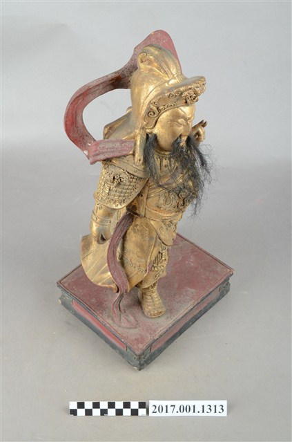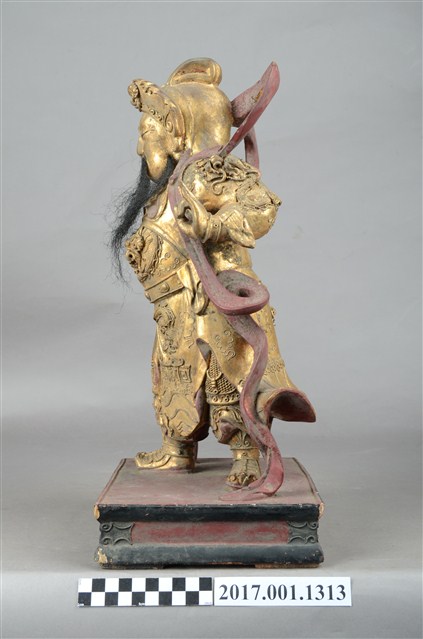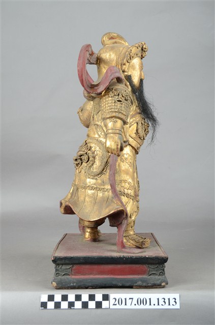 1.本件木雕伽藍尊者像,表面施作安金不見紅漆線盤飾粧佛技法。顏面表現壯年男性相貌,雙目半睜,五糾長鬚,頭戴盔,身著鎧甲,披飄帶,腳套履,造像正面漆線盤飾鎧甲的甲紋、頓頭紋、蟒紋,造像背面漆線盤飾浪花紋、雲紋、蟒紋。立像挺身以雙足丁字步的姿態站於臺座上,左手伸食指與小指收三指,右手向下握拳,持物已缺失,持物推測為關刀。