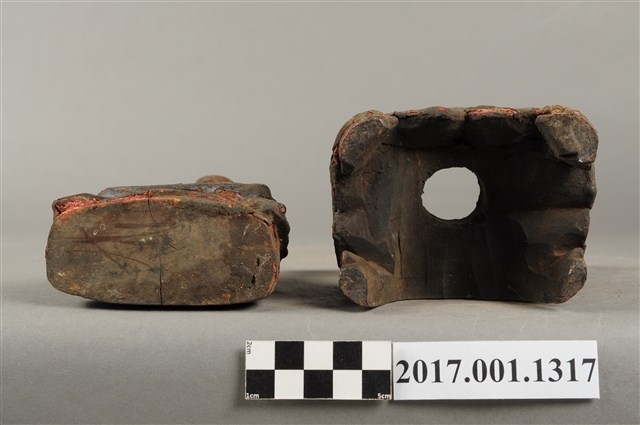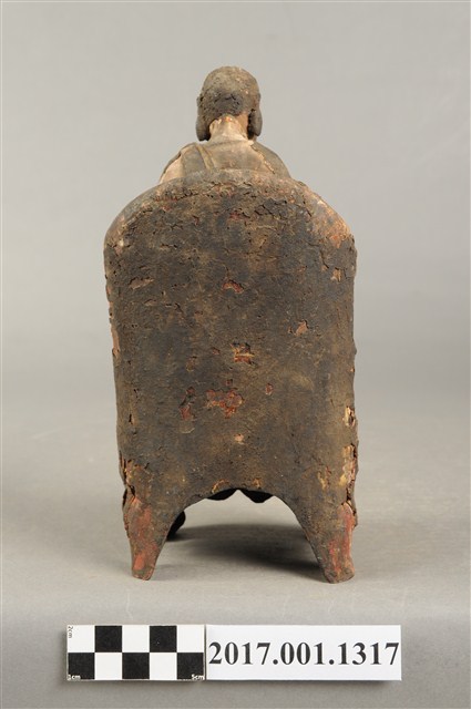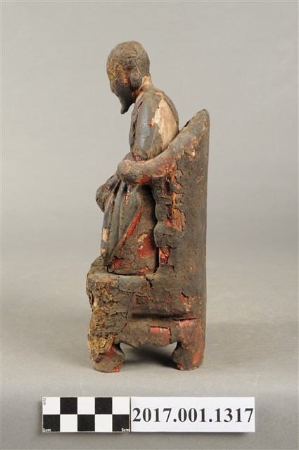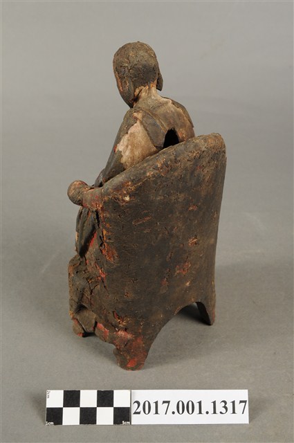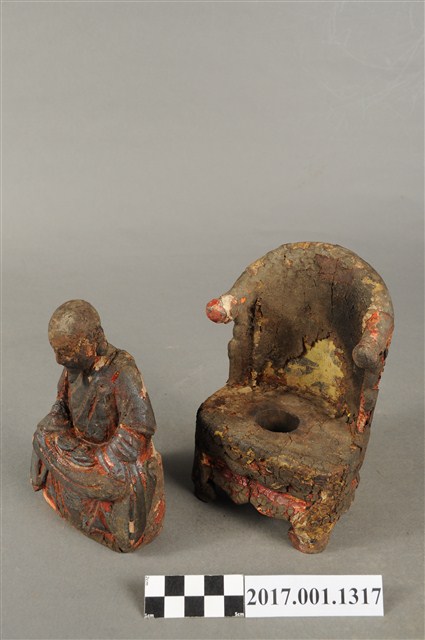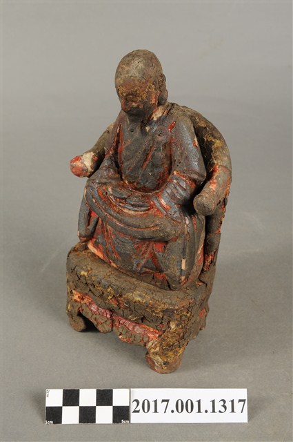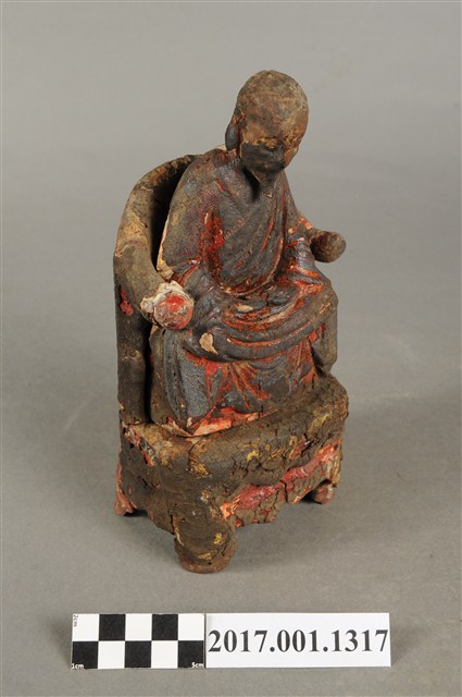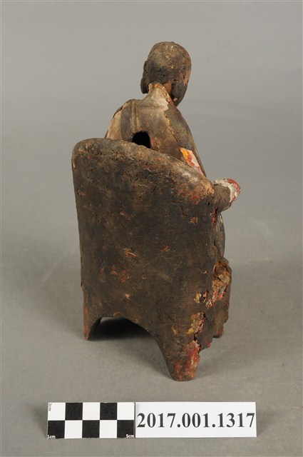1.本件木雕祖師像,作結跏趺坐姿態,坐於臺座上,表面施作塗裝粧佛技法,背面開有橢圓形入神洞,封榫佚失,內容物件已取出。顏面表現老年比丘相貌,耳垂大,蓄鬍,身著右衽寬袖僧袍,左肩綴有袈裟環釦。雙足盤腿,雙掌相疊成禪定印置於腹前。本件造像安放在圈背椅中,祖師像安置於圈背椅上。