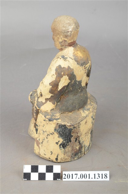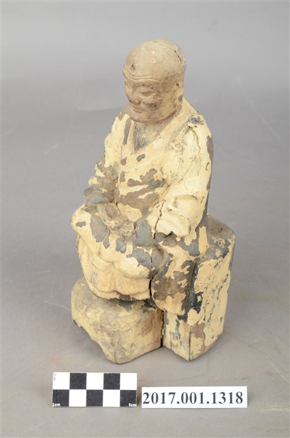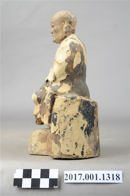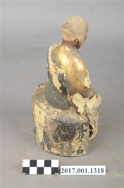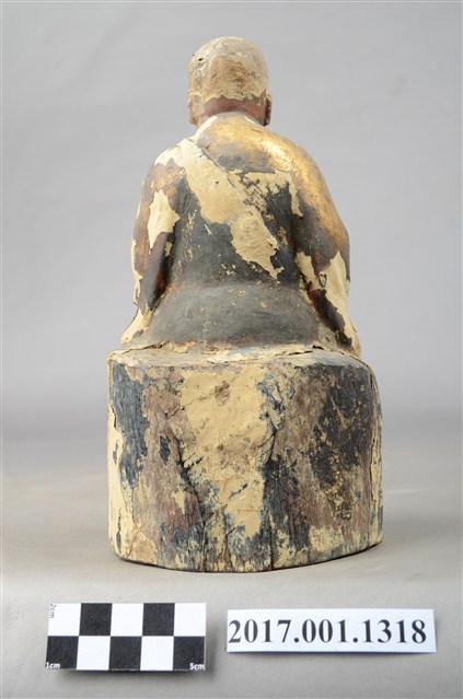 1.本件木雕祖師像,作結跏趺坐姿態,表面施作塗裝、安金不見紅粉線盤飾粧佛技法,局部粧佛剝落。顏面表現老年比丘相貌,抬頭紋深邃,雙目半睜,山根塌、鼻樑短,身著右衽寬袖僧袍,坐於臺座上。雙足盤腿,雙手相疊成禪定印置於腹前。